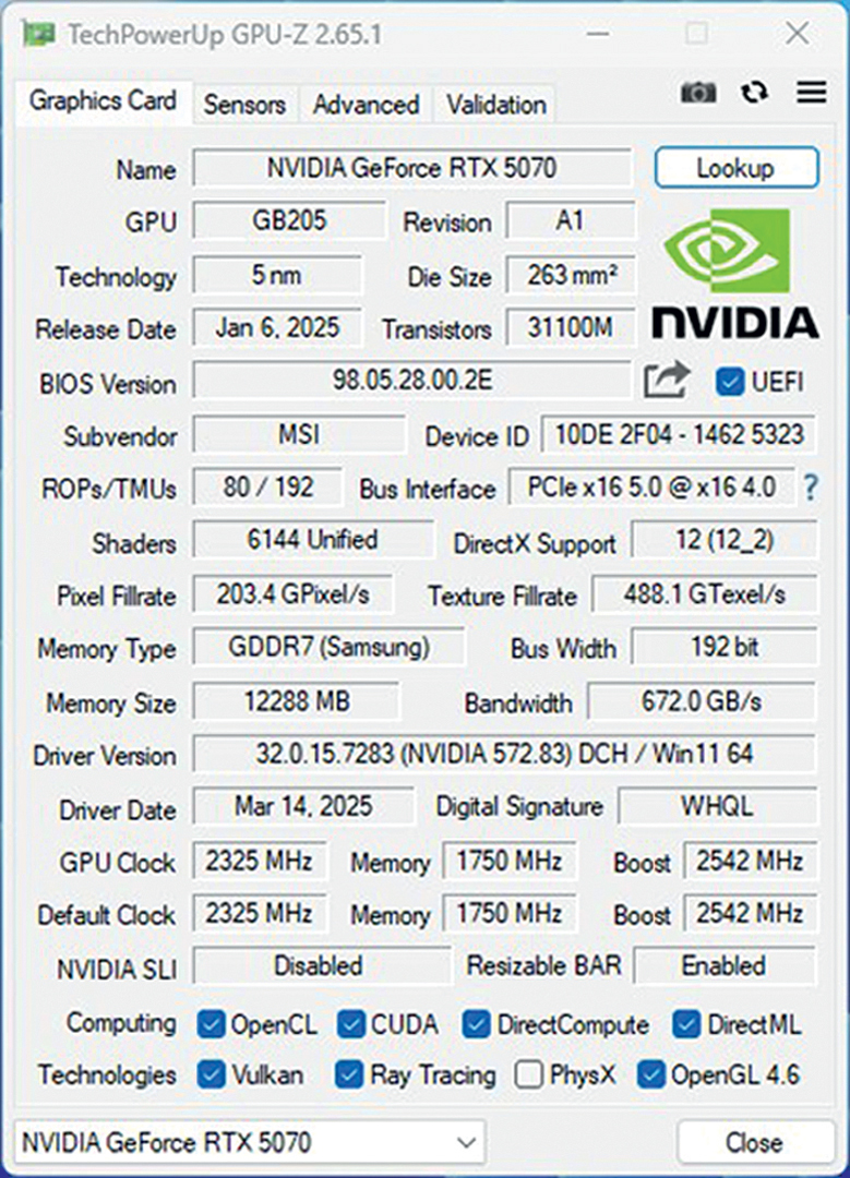 RTX 5070, dakako, podržava sve tehnološke novosti koje donosi RTX 5000 serija kartica. Prije svega ovdje mislimo na korištenje PCIe 5.0 sabirnice, podršku za DLSS 4 uključujući multi-frame generation tehnologiju, kao i napredne ray tracing i AI mogućnosti.