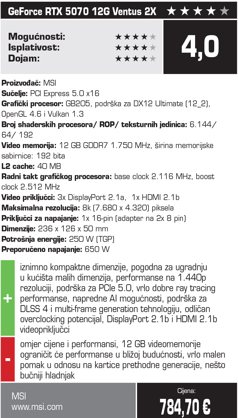 U svakom slučaju, MSI-jeva izvedba RTX 5070 kartice prije svega je namijenjena korisnicima koji žele karticu najnovije generacije posebno malih dimenzija koja je pogodna za ugradnju u manja kućišta. Također, RTX 5070 je trenutno najpristupačnija Nvidijina kartica nove generacije s podrškom za DLSS 4, pa ćete je odabrati ukoliko su vam upravo te mogućnosti najvažnije. U konačnici, Radeon RX 9070 kartice ipak nude bolji omjer cijene i mogućnosti, ali neke prednosti Nvidijine arhitekture svakako jasno dolaze do izražaja i kod ovakve RTX 5070 kartice.