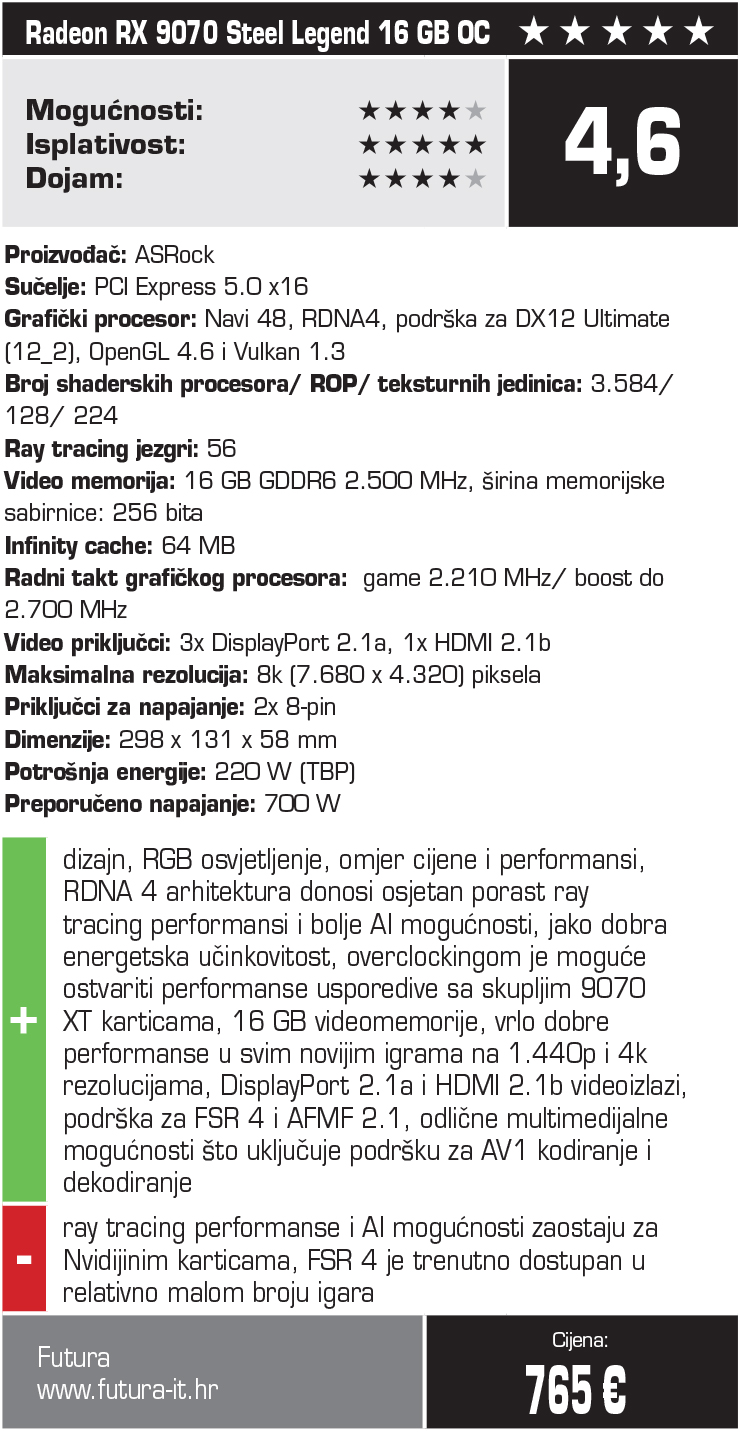 Moramo ipak reći kako nam ASRock ovdje nudi vrlo kvalitetnu i atraktivnu 9070 karticu kojoj praktički ne možemo naći ozbiljniju zamjerku. Posebno će zbog dizajna biti zanimljiva svima koji posjeduju kućište i druge komponente bijele ili svijetle boje.