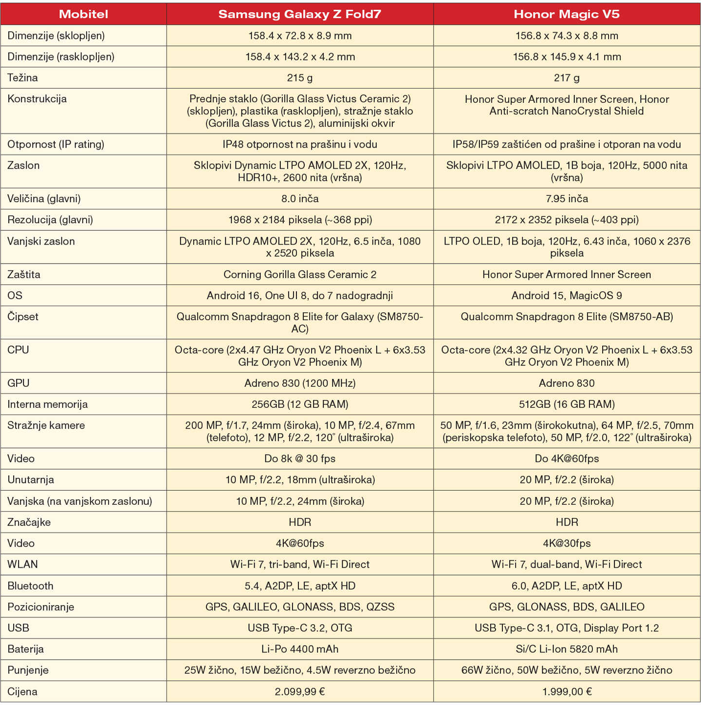 Honor svoj model isporučuje sa zaštitnom naljepnicom na unutarnjem, ali i vanjskom zaslonu, dok su mjerenja debljine rađena bez tih naljepnica, pa cijela priča dobiva dodatne implikacije. Prema službenim dimenzijama, Samsung Fold7 tako ima debljinu 4,2 mm kada je otklopljen, dok Honor Magic V5 ima 4,1 mm. Sklopljenima im debljina raste na 8,9 mm za Samsung te 8,8 mm za Honor. Ove vrijednosti podjednake su flagship mobitelima standardnog dizajna, što samo dodatno potvrđuje impresivnu tehnološku inovaciju kod ovih modela.