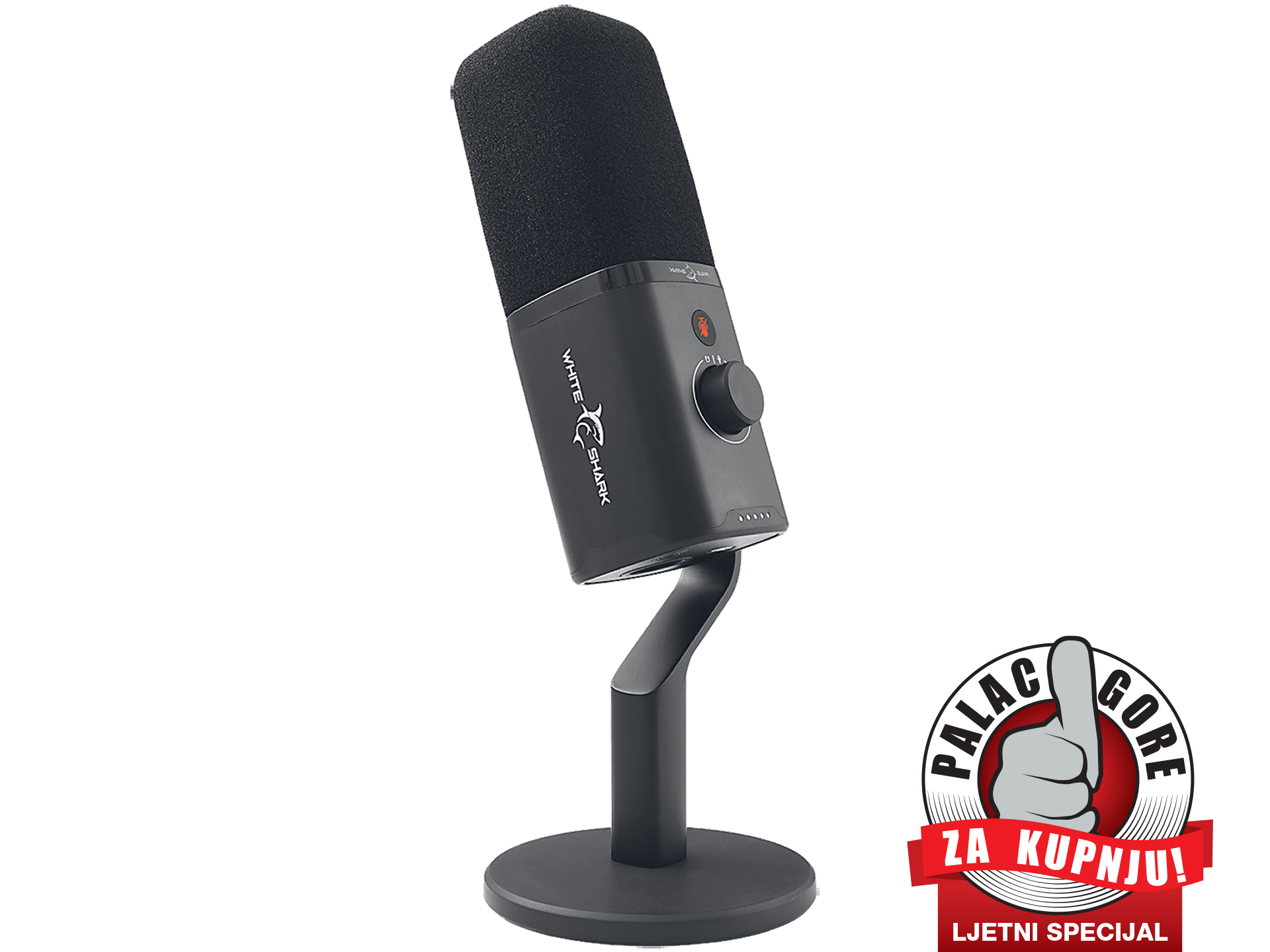 Za: Ovaj klasičan kardioidni dinamički mikrofon idealna je opcija za sve koji se upuštaju u neku od raznih zanimacija, od streaminga do stvaranja digitalnog video i audio sadržaja, bio to informativan video ili podcast. Dovoljna je i želja da vas ekipa u chatu bolje razumije i s ovakvim mikrofonom teško ćete pogriješiti. White Shark Udukku već dolazi s postoljem te ne zauzima puno prostora na vašem stolu i dobivate sve što vam treba za rad, a to je USB-C u USB-C kabel koji sa strane računala ima i dodatan USB-A adapter, pa se može lako spojiti na svako računalo. Osim direktnog povezivanja sa računalom, straga imate dodatan XLR ulaz te ovaj mikrofon možete povezati na različitu audio opremu, poput miksera kojim ćete raditi daljnju obradu nad zvukom. Straga se još nalazi i 3.5 mm utor za slušalice, kako biste mogli imati nadzor nad zvukom kojeg mikrofon hvata. Kada ga povežete s računalom, primijetit ćete paljenje bijelih točkica, a one označavaju glasnoću snimanja te se ona može kontrolirati zakretanjem valjka. Sve oznake ispisane su na mikrofonu tako da budu jasne samom korisniku ispred mikrofona. Pritiskom na valjak, svjetlo točkica mijenja se u plavo, a to označava kontrolu glasnoće za povezane slušalice sa stražnje strane. Površina gdje je nacrtan crveni mikrofon osjetljiva je na dodir te čim ju dotaknete, gasite rad mikrofona, a spomenute lampice onda svijetle crveno. Preko samog mikrofona imate spužvastu zaštitu od vjetra, dok ispod nje možete vidjeti da je sam mikrofon zaštićen mrežicom, pa mu manji udarci neće smetati. Spomenuto postolje morate pričvrstiti navojem, a sama ruka mikrofona ima dva navoja: 3/8” i 5/8”, tako da se može lako povezati s velikim brojem nosača trećih strana, ovisno o vašim željama i potrebama.