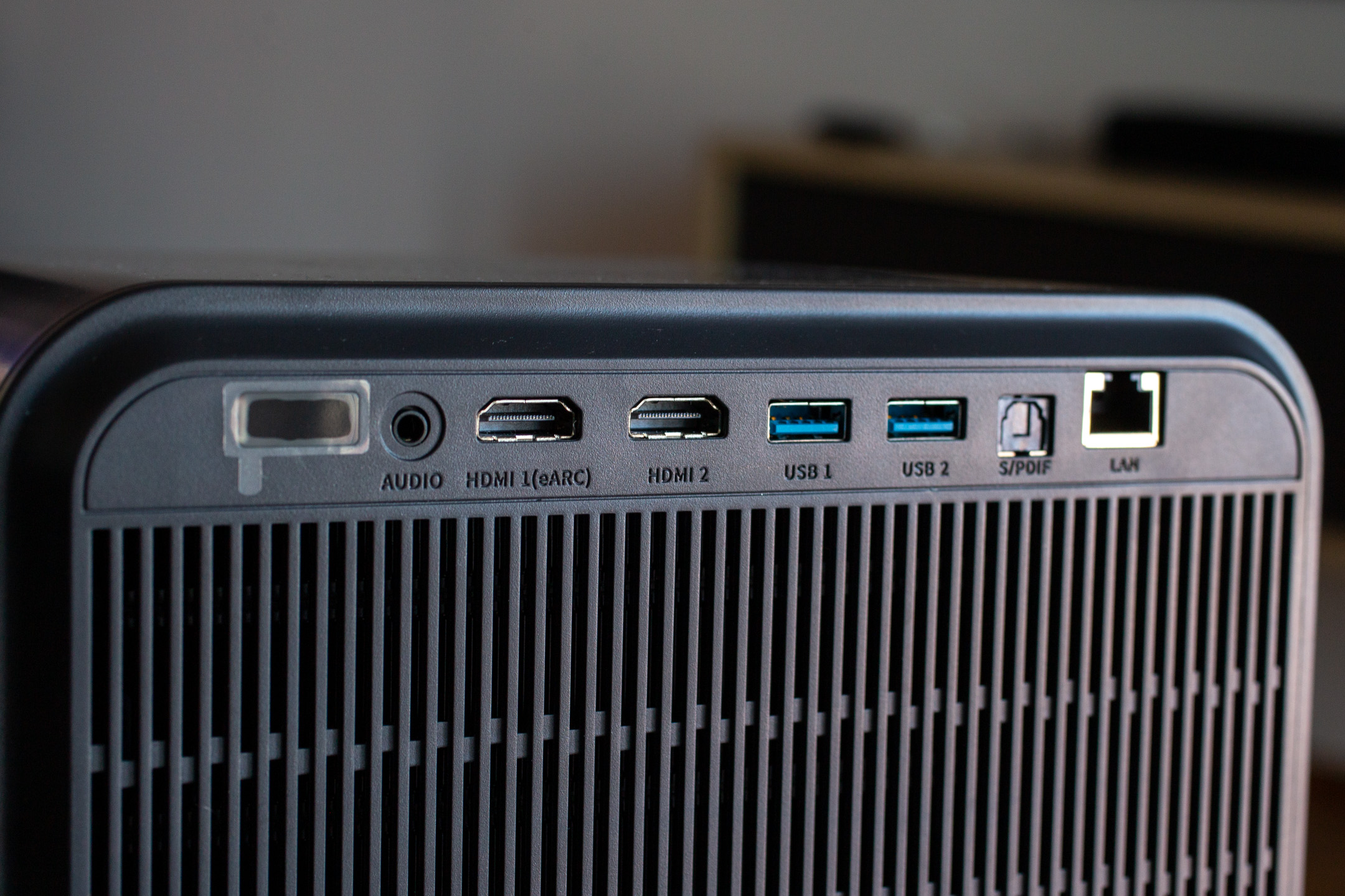 Sam projektor straga ima dodatne utore, a tu su dva HDMI 2.1 utora od kojih je jedan i eARC kompatibilan pa je projektor lako upariti i sa soundbar sustavom. Možete na njega spojiti razne konzole ili računalo, za nezaboravno iskustvo gaminga bez visokog latencyja zahvaljujući dediciranom načinu rada za gaming, a sve podržava 4K sadržaj. Tu su i dva USB utora koji omogućuju gledanje sadržaja i direktno sa raznih medija, a dodatno za audio imate optički i 3,5mm konektor, a sami integrirani zvučnici optimizirani su od strane JBL-a.