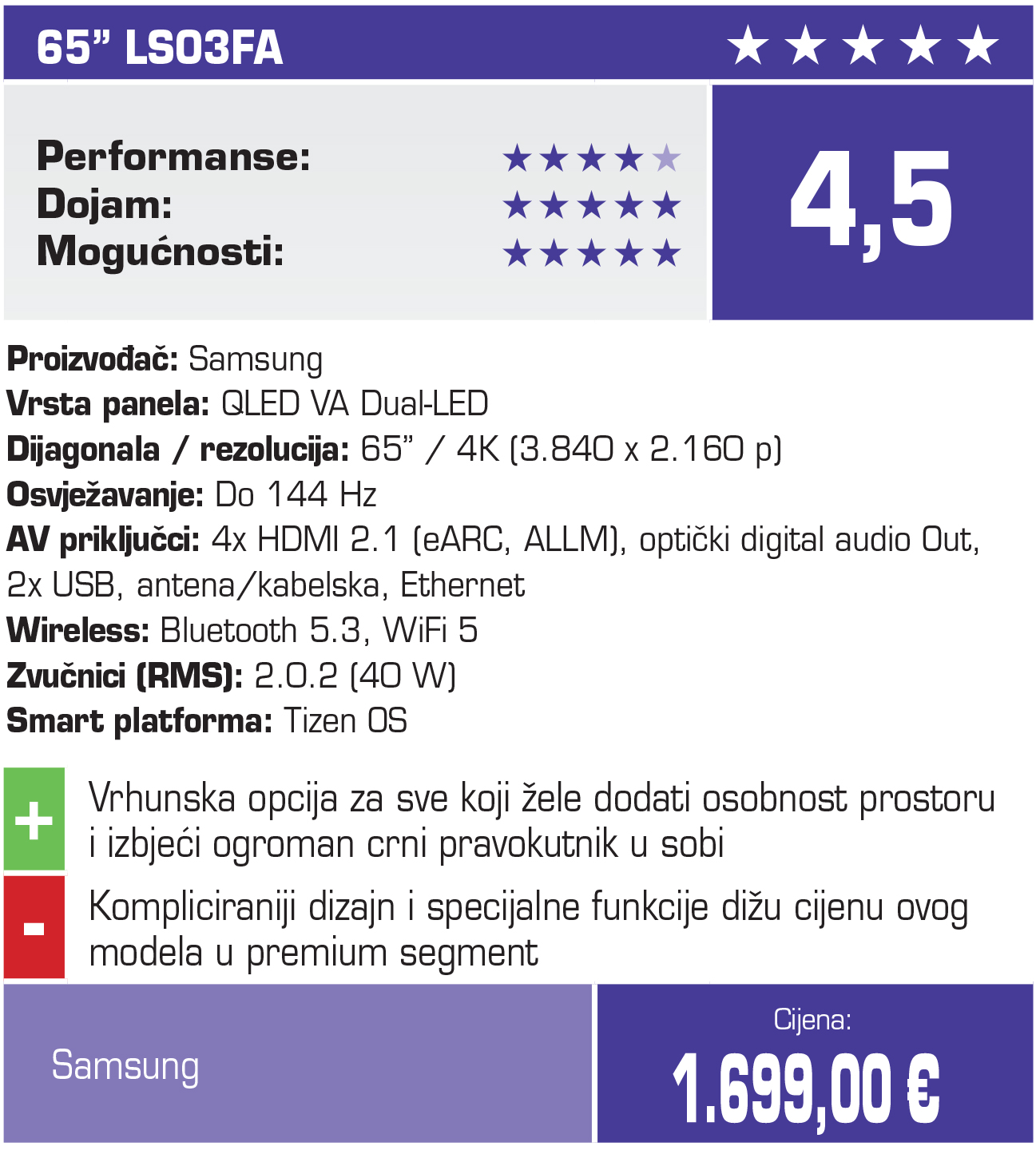 Samsung je zato ovim modelima prenio tehnologiju iz premium ponude u obliku One Box sustava, gdje je glavni „mozak“ televizora zajedno sa svim konektorima odvojen od samog televizora. Na njega povezujete napajanje i sve druge uređaje, a sa samim TV panelom povezan je jedinstvenim kablom koji televizoru daje napajanje i sve podatke. Sama žica je osjetno stanjena te je svojim dizajnom teško primjetna, a lako bi ju bilo i „ukopati“ u zid, s malo truda, taktika s kojom imamo i osobnog iskustva. Kutija s konektorima sa stražnje strane ima antenske priključke, optički audio konektor, LAN konektor te četiri HDMI 2.1 utora, od kojih je jedan dizajniran s eARC funkcijom, idealnom za povezivanje soundbar sustava. Na kraju, tu je i jedinstveni konektor za spomenutu žicu koja kutiju povezuje sa TV panelom. Na samom televizoru straga imate VESA kompatibilne držače za montažu i konektor za povezivanje s One Box sustavom. Pri dnu su i držači za noge televizora koje dobivate, a cijeli dizajn je „tool-less“, odnosno nisu vam potrebni alati, već se cijeli televizor može postaviti bez ikakve muke. Za postavljanje na zid već u kutiji dobivate Samsungov „nevidljivi“ nosač, čiji je cilj da bude iznimno tanak i tako priljubi televizor uz zid. Montaža je također jednostavna - na zid se pričvrsti veći dio nosača, dok dvije „kuke“ idu na samu stražnju stranu televizora, te je na vama samo da televizor „zakvačite“ na zid – kao sliku. Za kraj, tu je i sama funkcija imitacije slike.