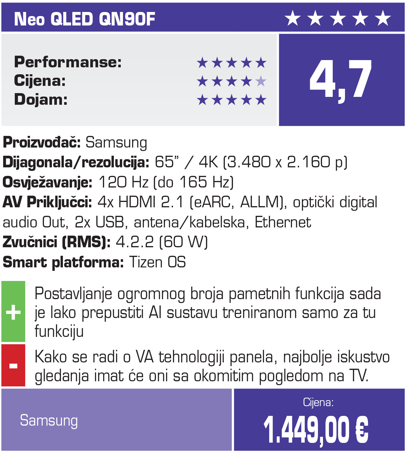 Sam fizički dizajn televizora uvijek će biti ograničavajući faktor za zvuk, pa Samsung nudi i vlastita soundbar rješenja, sa mogućnošću povezivanja u Q-Symphony sustav gdje zvučnici televizora i soundbara rade u tandemu za maksimalnu iskoristivost dostupnih resursa i odlično audio iskustvo na kraju dana. Na kraju, tu je i samo prednje staklo koje je ove godine postalo suptilno matirano. Značajno umanjuje direktne refleksije, pa je TV impresivno vidjeti i ugašen u dobro osvjetljenom prostoru. Matirano staklo zajedno sa vrlo impresivnim upijanjem svjetla osigurava visok kontrast kod gledanja sadržaja, bez obzira na ambijentalno osvjetljenje.