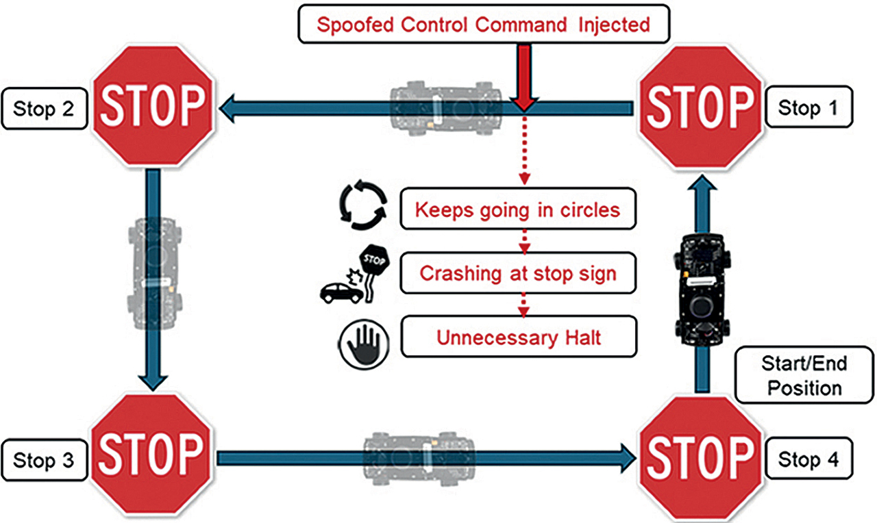 Primjer nakon ugrađivanja malicioznog paketa u autonomna vozila gdje su mogući različiti napadi - od navođenja vozila da vozi u krugovima, sudaranje u znak za STOP te nepotrebna zaustavljanja. Izvor: https://arxiv.org/html/2511.00140v1