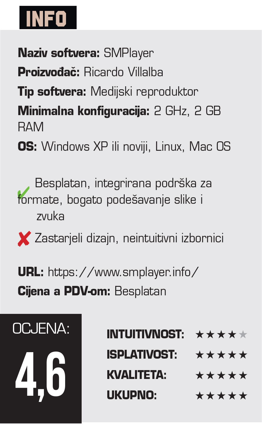 U vremenu smo kad brojni besplatni alati i programi koje smo godinama koristili postaju komercijalni proizvodi. Njihova naplata nije došla preko noći, već su prvo počeli s besplatnom i Pro inačicom, da bi svakom novom verzijom pomalo micali mogućnosti besplatne inačice, dodavali reklame i tražili druge načine kako bi dugogodišnje vjerne korisnike natjerali na kupovinu nove verzije. Postoji li onda softver koji je odolio novom valu komercijalizacije i ostao dosljedan filozofiji da softver mora biti besplatan i svima dostupan. Na tržištu medijskih reproduktora, to je SMPlayer, manje poznatiji reproduktor video i audio datoteka koji je na tržištu već gotovo dvadeset godina. Zasnovan na moćnom MPV/MPlayer engineu, SMPlayer je počeo kao Linux i Windows XP reproduktor, a kasnije su izašle inačice za novije generacije Windows OS-a, kao i Mac OS. Njegova prednost je što dolazi s integriranim kodekima, pa praktički ne postoji format kojeg SMPlayer neće reproducirati, a kako se vrlo učestalo nadograđuje sam alat, tako se nadograđuje i podrška za moguće nove formate i enkodiranja video zapisa na tržištu. Unatoč tome što je besplatan, alat ima odlične opcije za podešavanje slike i zvuka, znatno moćnije od daleko razvikanije konkurencije. Ipak, ako ćemo tražiti mane, upravo te, ali i brojne druge opcije su sakrivene u zastarjelim i neintuitivnim izbornicima, pa je potrebno dosta vremena i volje kako bi se sve podesilo prema željama zahtjevnijih korisnika. Ne pomaže ni pomalo nespretan prijevod naprednijih opcija, pa preporučamo da koristite izvorni engleski jezik za sučelje alata. Radi se o moćnom reproduktoru koji je godinama na sceni. Stabilan je u radu i bez ikakvih problema je pokretao i najegzotičnije formate koje smo pronašli na disku. Dok god je besplatan i pouzdan, bit će naš prvi izbor.