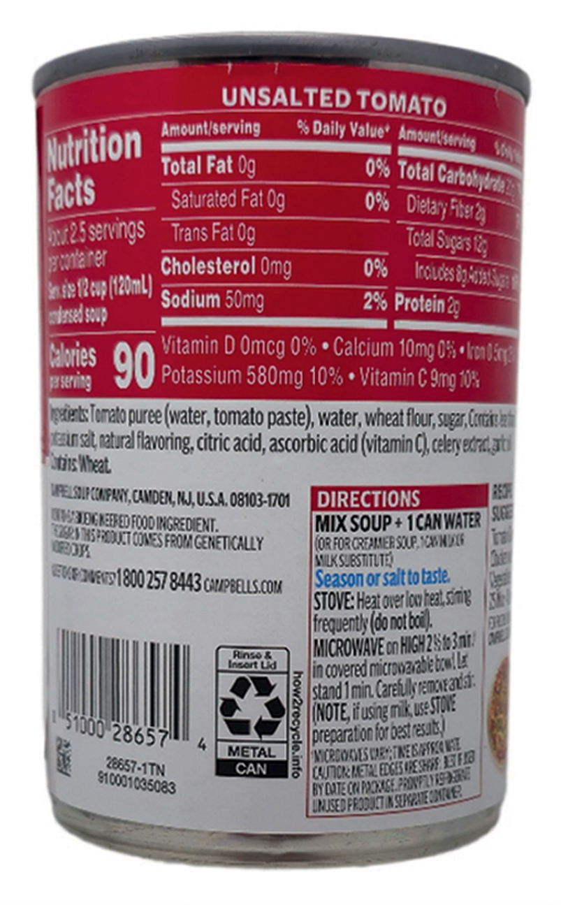 Slika 2. Software Composition Analysis, odnosno sastojci juhe od rajčice. Kako juha od rajčice u konzervi ima popis sastojaka od kojih je načinjena, tako i softver ima sastojke od kojih je načinjen. Neki su sami uzgojeni (izrađeni) kod proizvođača, a neki su kupljeni sa stranog tržišta – rajčice iz polja sunčanih zemalja Južne Amerike ili kvalitetna biblioteka iz bespuća interneta bez aktivnih održavatelja i sumnjivog koda. Izvor: https://healthyheartmarket.com/products/campbells-condensed-unsalted-tomato-soup-10-75oz?srsltid=AfmBOorVF2fKUd7ZtBZxqXAMy6Ejhrs6QunrIMakQPpfrBenCI2nizBX