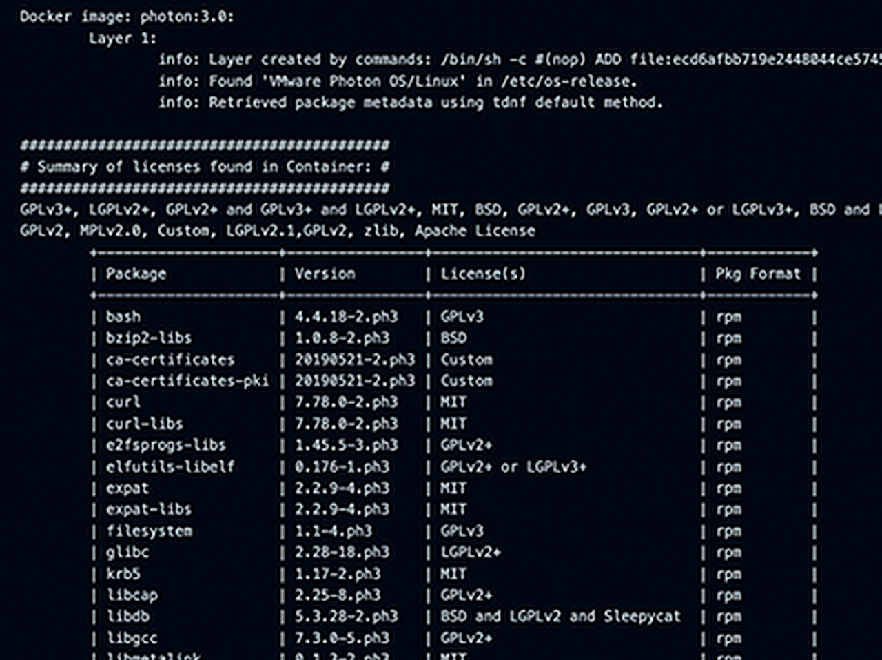 Slika 3. Ovako izgleda SBOM tj. dokument s popisom sastojaka od kojih je softver izrađen. Ovaj dokument se kreira u trenutku izrade aplikacije i šalje na reviziju sustavima za upravljanje ranjivostima. Sustavi za upravljanje ranjivostima su povezani s bazama ranjivosti i mogu nam ukazati na to ima li koji sastojak sigurnosni propust. Na slici se može vidjeti naziv paketa (Package), verzija (Version) i licenca (License).