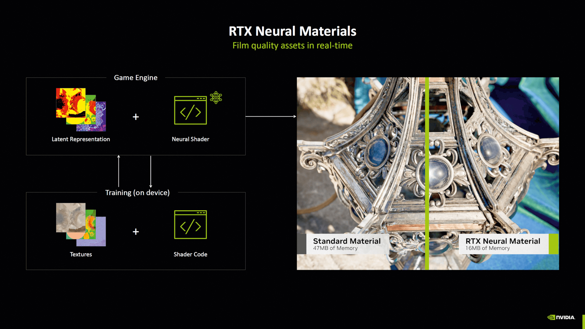 S novom generacijom kartica Nvidia najavljuje nove neuronske shadere koji bi trebali omogućiti korištenje AI jezgri za direktno poboljšanje grafičkog prikaza, odnosno za optimizaciju kvalitete tekstura uz manje zauzeće videomemorije