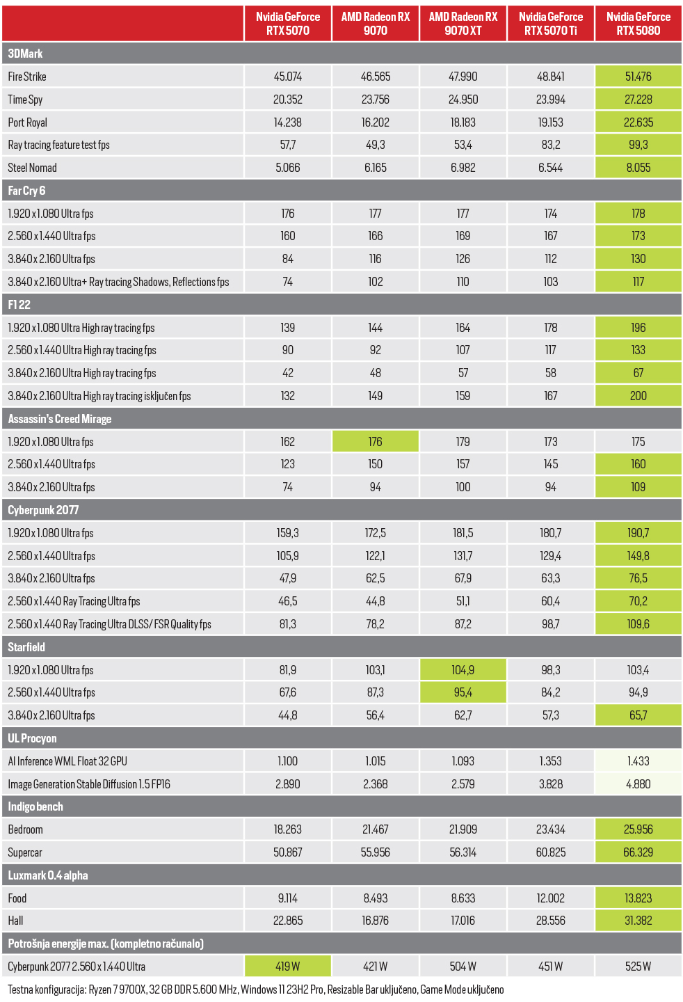 Ostale četiri testirane kartice zapravo su direktna konkurencija i cjenovno su poprilično usporedive, a pri tome mislimo na RTX 5070 Ti, Radeone RX 9070 XT i RX 9070, kao i na RTX 5070.