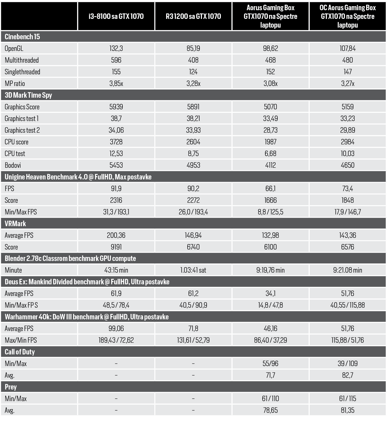 U tablici su prikazani rezultati koje smo dobili na desktop stroju s klasičnom desktop karticom GTX 1070 te smo ih usporedili s Gaming Box rješenjem spojenim na HP Spectre ultrabook. Primjećujete kako su rezultati i do 50% slabiji u igrama zbog toga što je i sam procesor našeg ultrabooka mobilni i time usko grlo za iskorištavanje punog potencijala GTX 1070 grafičke kartice. No s obzirom na to da su to i očekivani rezultati te je igranje igara prolazilo sasvim glatko, a rezultat renderiranja u Blenderu pokazuje kako je ipak ovakvo rješenje iskoristilo CUDA potencijal grafičke kartice te je test Classroom scene završio u 9 minuta i 19 sekundi, preporučujemo ga svakome tko ima potrebu nadograditi laptop ili ultrabook grafičkom karticom. Situacija je nešto bolja dignete li takt grafičke uz pomoć OC gumba u Aorus Graphics Engine softveru.