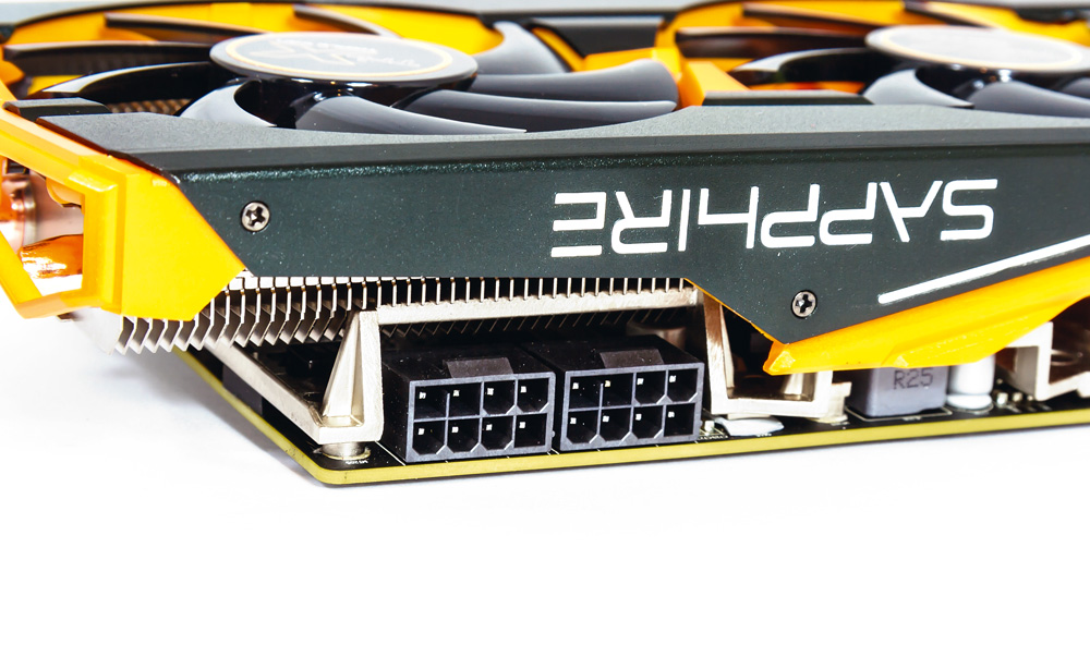 “Zahvaljujući” tom velikom aftermarket hladnjaku, duljina graifčke kartice je sve samo ne standardna. Svakako pripazite na veličinu kućišta i količinu prostora u njemu ukoliko mislite nabaviti ovu karticu. Stražnja strana kod Tri-X ne otkriva metalni backplate kao kod Vapor-X modela, što možda i nije toliko strašna stvar funkcionalno gledajući, koliko će nekima biti estetski. Da, on čini karticu čvršćom i prije svega rigidnijom, pogotovo kada je riječ o ovakvo velikom modelu koje se doslovno savija pod vlastitom težinom, ali ako smo do sada “izdržali” bez njih, ne vidimo razloga zašto ne bi i dalje, pogotovo kada je ušteda u pitanju.