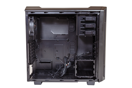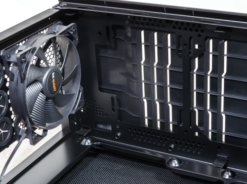 Sa stražnje strane nalazi se još jedan predinstalirani 120 mm BeQuiet Pure Wings 2 ventilator, a iako se teško može razabrati s gornje strane, moguće je instalirati radijatore ili ventilatore.