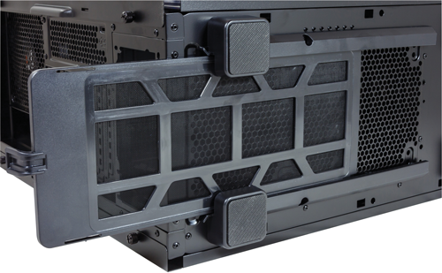 Donja strana kućišta otkriva rigidne noge s gumenim podlošcima i veliki filtar za prašinu koji pokriva područje i sprječava ulaz prašine u napajanje, a preko još jednog opcionalnog mjesta za instalaciju ventilatora s donje strane, i u kućište. Isti takav filter naći ćete s prednje strane kućišta, kao i jedan predinstalirani 120 mm BeQuiet Pure Wings 2 ventilator.