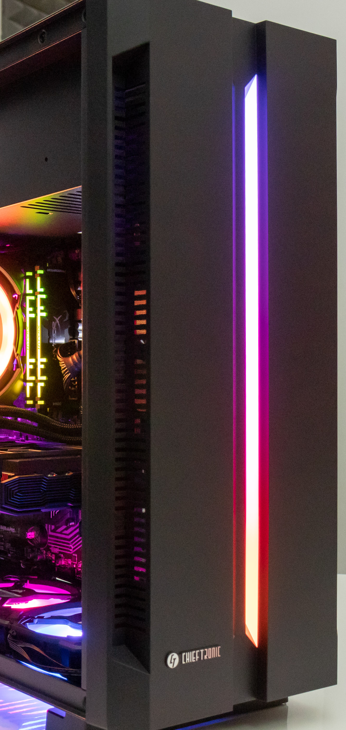 Pored njega imamo manji gumb koji se tradicionalno koristi za restart računala, no standardno Chieftronic ovaj gumb koristi za nešto drugo. On je povezan sa kontrolerom straga te kontrolira rasvjetu kako kućišta, tako i svih RGB komponenti poput ventilatora.
