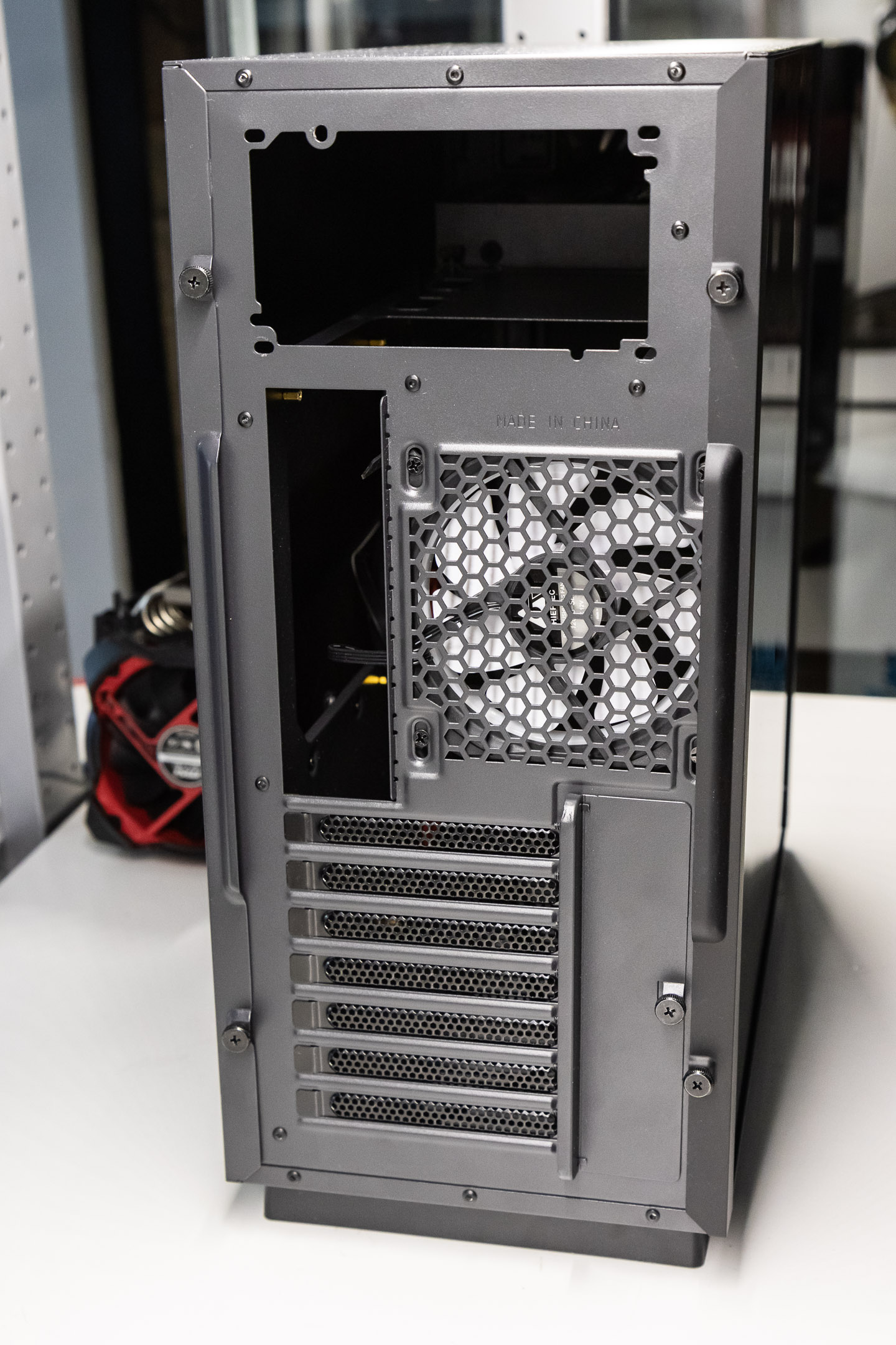 Stražnja strana prva daje na znak da se kućište malo razlikuje od modernog standarda. Naime, otvor za napajanje nalazi se na vrhu stražnje strane kućišta, dok ispod njega nailazimo na standardni otvor za ventilator od 120 mm. Tu je i prorez za I/O od matične ploče, te ispod njega imamo standardnih sedam proreza za PCIe komponente.