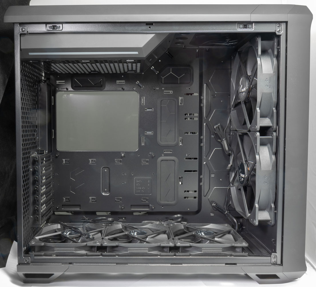 Spomenuti su ventilatori, u skladu s dimenzijama kućišta, također ogromni. S prednje strane nalaze se ukupno dva 180 mm ventilatora koji doista mogu stvoriti konkretan propuh uz relativno malu količinu buke. S donje strane, također standardno, Torrent dolazi s ukupno tri 140 mm ventilatora. Jedna od osebujnosti Torrenta svakako je i smještaj (povratak?) napajanja na vrh kućišta, tako da nas je ovo kućište pomalo vratilo u prošlost.