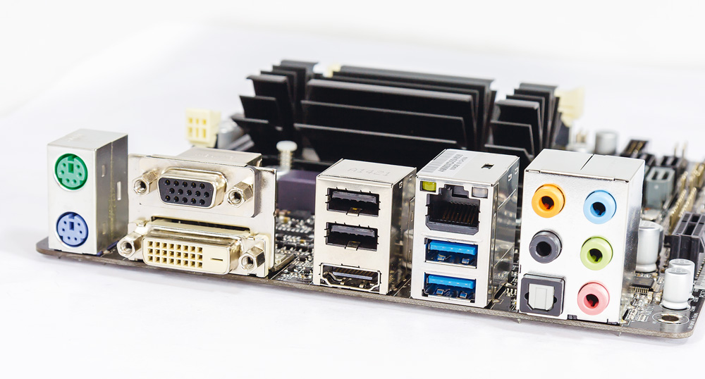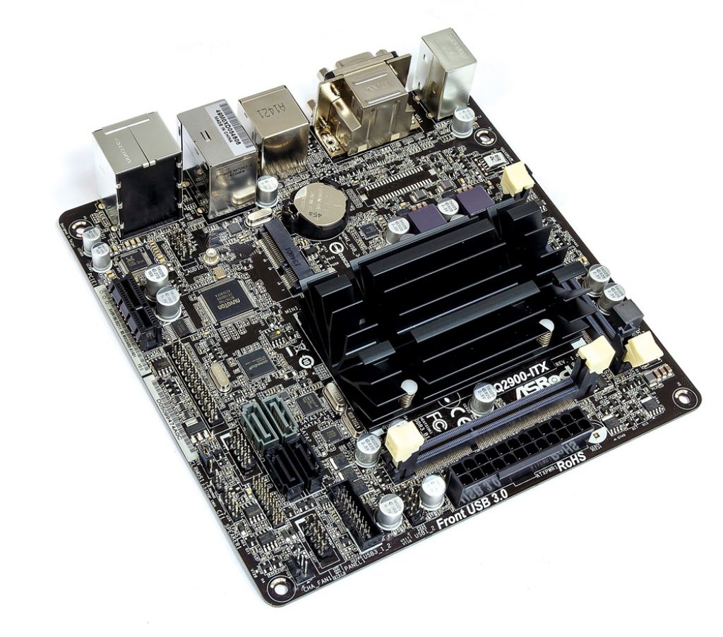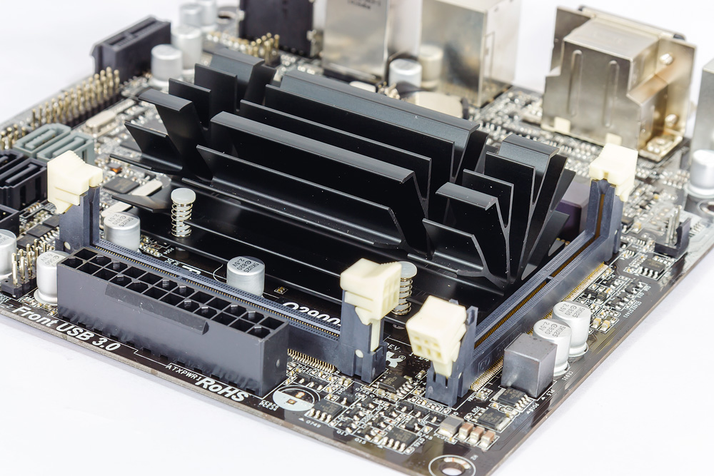 Obzirom na vrlo nisku potrošnju ove platforme, na ploči se nalazi samo jedan 24-pinski ATX power konektor, bez prisustva dodatnog 4 ili 8-pinskog EPS-a. Kako se radi o mobilnoj platformi, ploča koristi DDR3L SO-DIMM RAM, dva slota lijepo posložena odmah oko velikog pasivnog hladnjaka. Upravo taj hladnjak bez problema hladi J2900 i pritom ne zahtijeva nikakav dodatan ventilator, što buku u radu ostavlja na 0 dB.