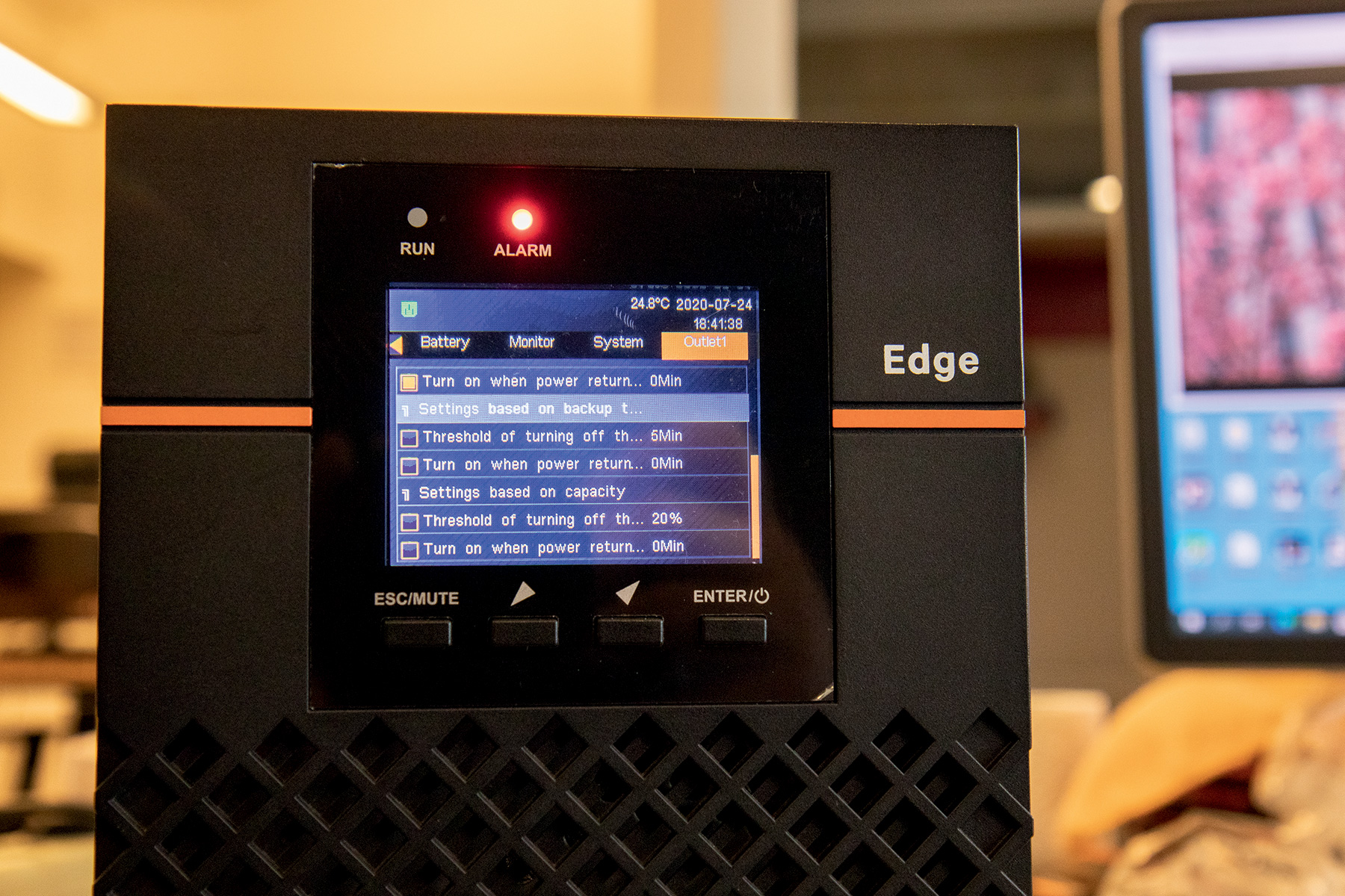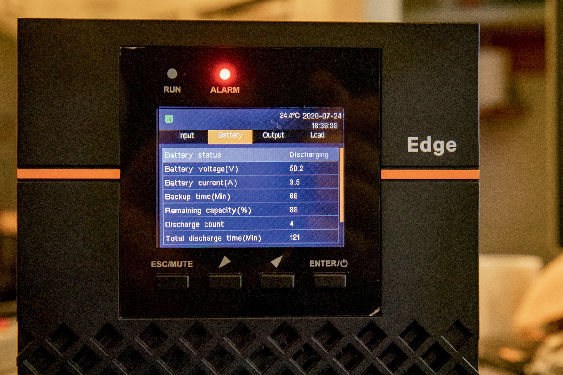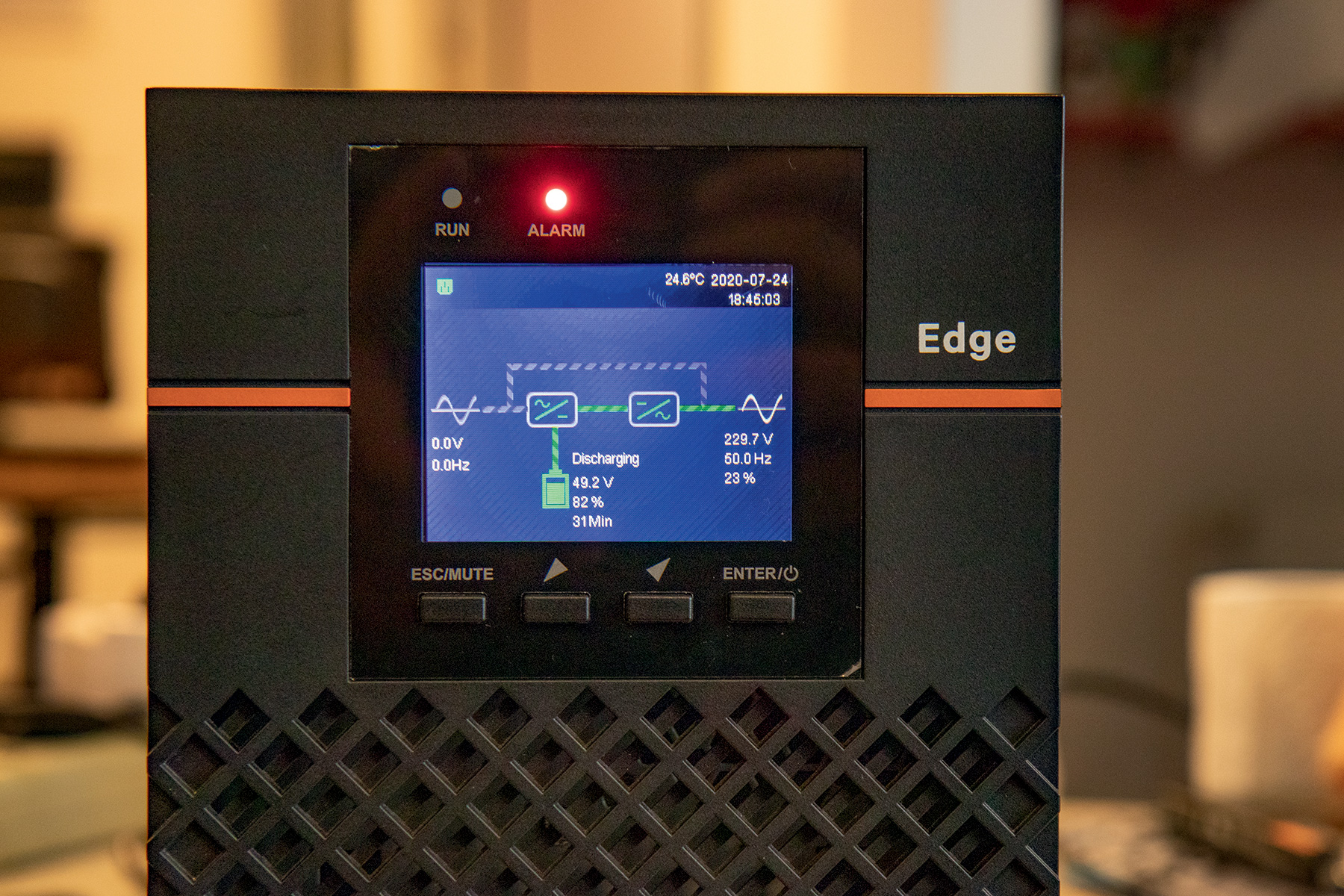 Osim ventilatora, ima i vlastiti alarm kako biste znali da je došlo do prekida napajanja iz mreže. Ako je potrebno, na njega se može dodati još eksternih baterija za dulji rad u slučaju prekida napajanja. Naravno, baterije se također pokušavaju maksimalno zaštiti s opcijom da se UPS gasi na oko 50% kapaciteta, kao i zaštitom od “dubokog pražnjenja”, kako bi baterije imale višegodišnji životni vijek.