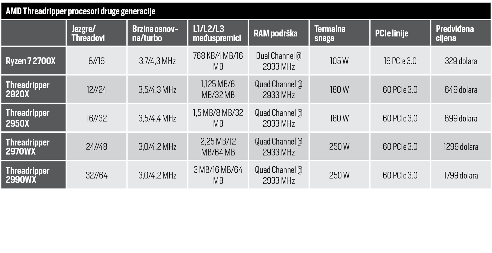 Podsjetimo se, prva generacija Threadrippera sastojala se od tri modela: 1900 sa osam jezgri, 1920 s 12 jezgri i 1950 sa 16 jezgri. Svi su, naravno, imali duplo više threadova, kao i današnja generacija. Druga serija ima četiri primjerka, a prva dva su generacijske nadogradnje na prijašnje procesore.