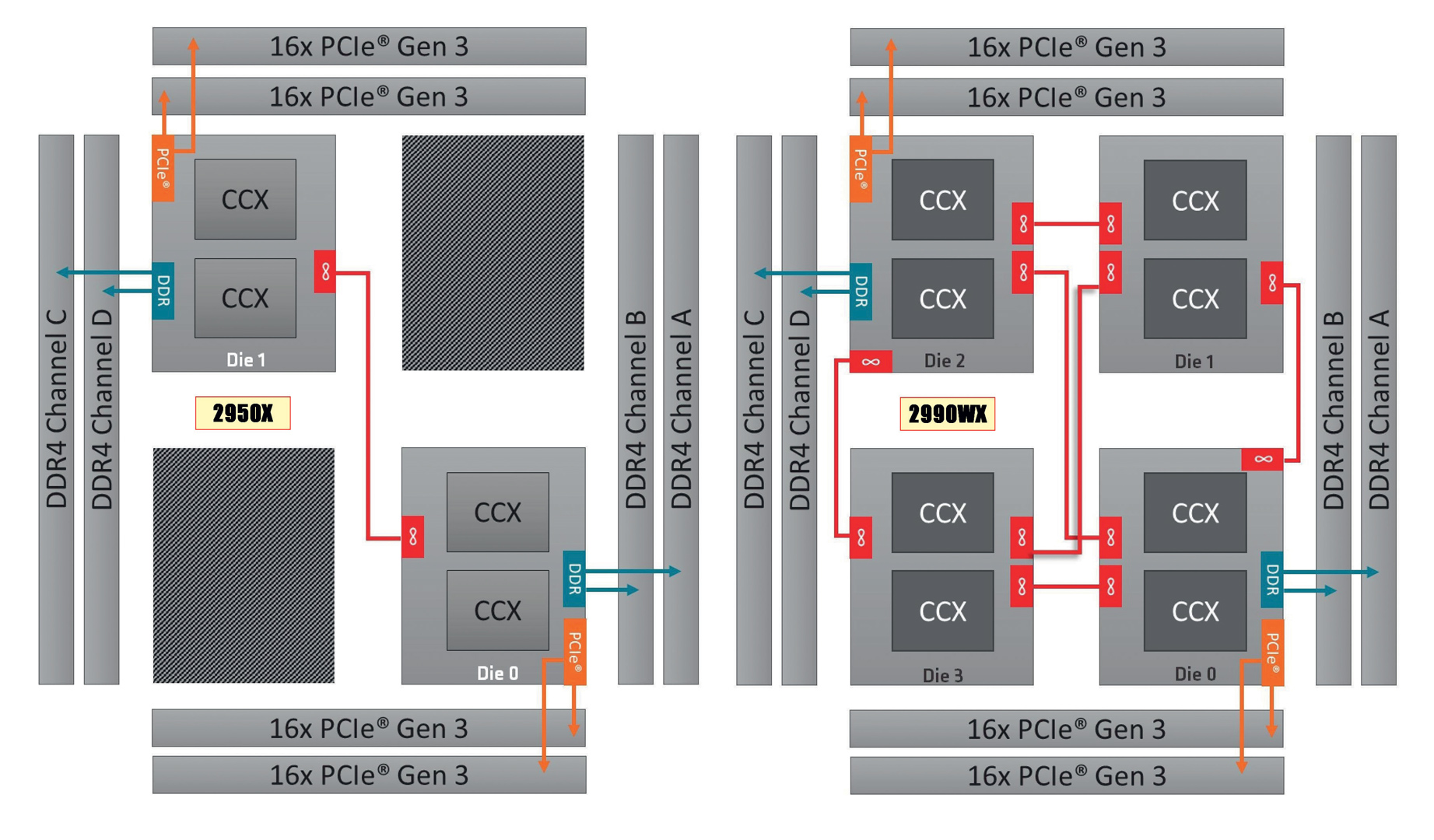 S četiri “keksa” RAM je službeno podržan do 2933 MHz, no sa svih osam utora popunjenih RAM-om podržana brzina pada na 2133 MHz. Naravno, ako vaša ploča to podržava, preporuča se uzeti što bržu RAM memoriju jer sustavu s Threadripperom to puno znači. Kako smo već spomenuli, u prvoj generaciji dva su čipa bila “lažna”, dok su u drugoj pravi. No oni nemaju vlastiti pristup RAM memoriji, već do memorije dolaze preko dva druga čipa, što usporava prijenos podataka u nekim specifičnim zadacima, kako tvrdi sam AMD.