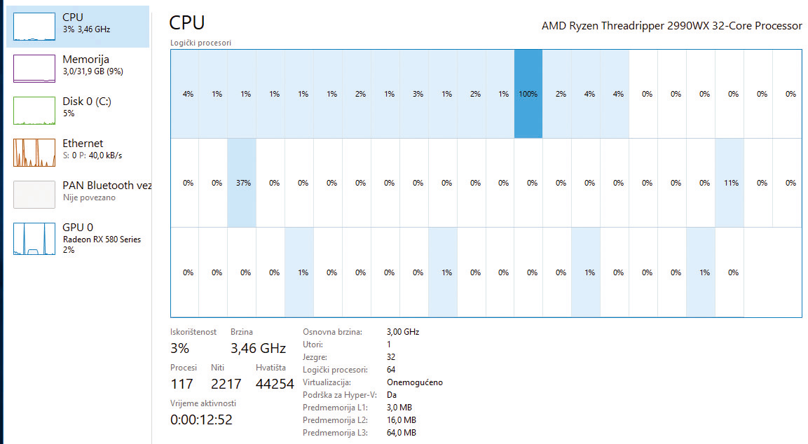 Kod nas se na testu, naravno, našao najbolji primjerak: Threadripper 2990WX. Prođimo kroz dobre hladne brojeve da vidimo što nam nudi. Novi flagship ima, dakle, 32 fizičke jezgre, koje uz malo dobrog managementa mogu vrtjeti 64 virtualne jezgre, to jest threada.