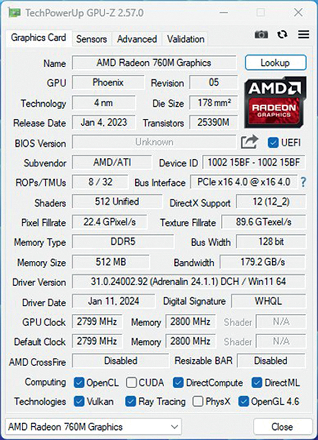 8600G posjeduje Radeon 760M, grafički čip s ukupno 10 računalnih jedinica koje rade na maksimalnom radnom taktu od 2.800 MHz