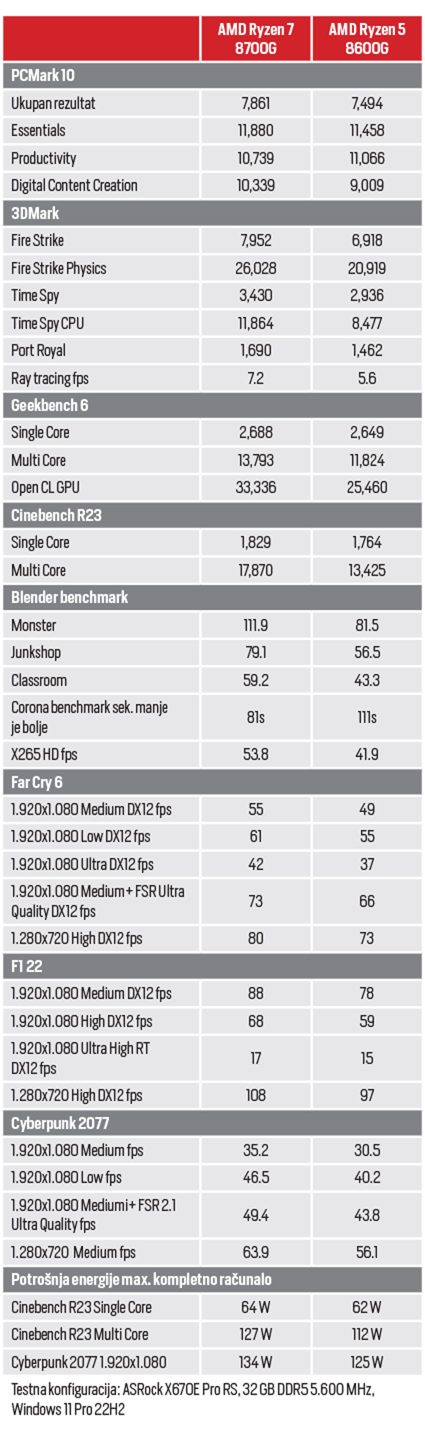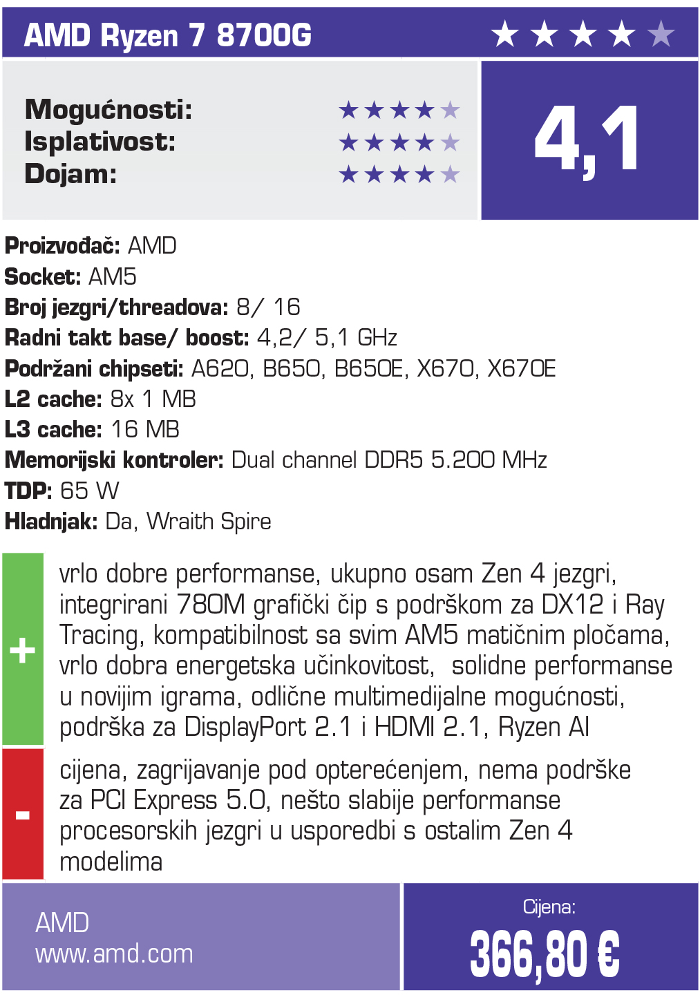 Na kraju, možemo samo zaključiti kako su novi Ryzeni serije 8000G do sada svakako najmoćniji AMD-ovi procesori s integriranom grafikom. Omogućuju vrlo dobru razinu performansi, a po prvi put su integrirani grafički čipovi dovoljno tehnološki napredni za igranje novijih igara. Posebno nam se ovi procesori čine pogodnima za ugradnju u mini računala vrhunskih performansi. Konačno, 8600G model nam se trenutno čini isplativijim od 8700G, posebno ukoliko su vam prije svega najvažnije multimedijalne mogućnosti i brzina integriranog grafičkog čipa.