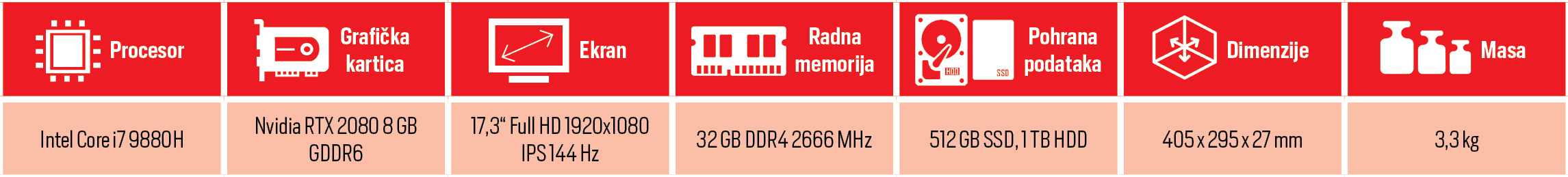 Riječ je o jednom od trenutno hardverski najmoćnijih laptopa na tržištu koji vam može ponuditi beskompromisne performanse u igrama. Iza svega stoji monstruozan ugrađeni hardver koji uključuje najnoviji Intelov mobilni procesor Core i9 s osam jezgri i Nvidijinu grafičku karticu RTX 2080.