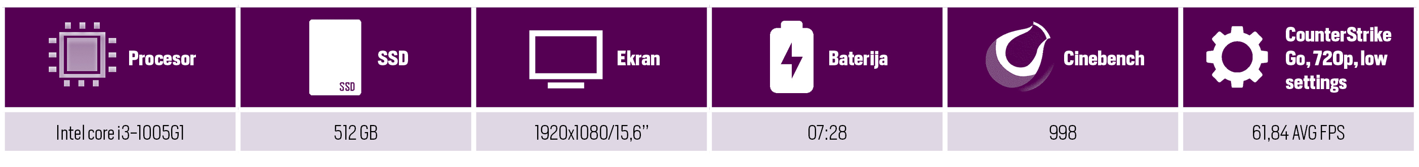 HP 15S stiže s novim Core i3-1005G1 procesorom koji ima dvije fizičke jegre i četiri threada, te je načinjen na 10 nm proizvodnom procesu. Vrlo je štedljiv što je potvrdio i naš test baterije, donja granica radnog takta podešena mu je na 1,5 GHz, a može dostići 3,4 GHz.