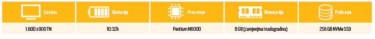 Od ostatka specifikacija, osim već spomenutog Pentium N6000 procesora od Intela, laptop dolazi sa 17,3-inčnim zaslonom koji u ovom slučaju koristi 1.600 x 900 rezoluciju. Dok slika možda nije toliko oštra kao na FullHD modelu, niža rezolucija svakako će pomoći ovom procesoru u obavljanju grafičkih zadataka za integrirani monitor.