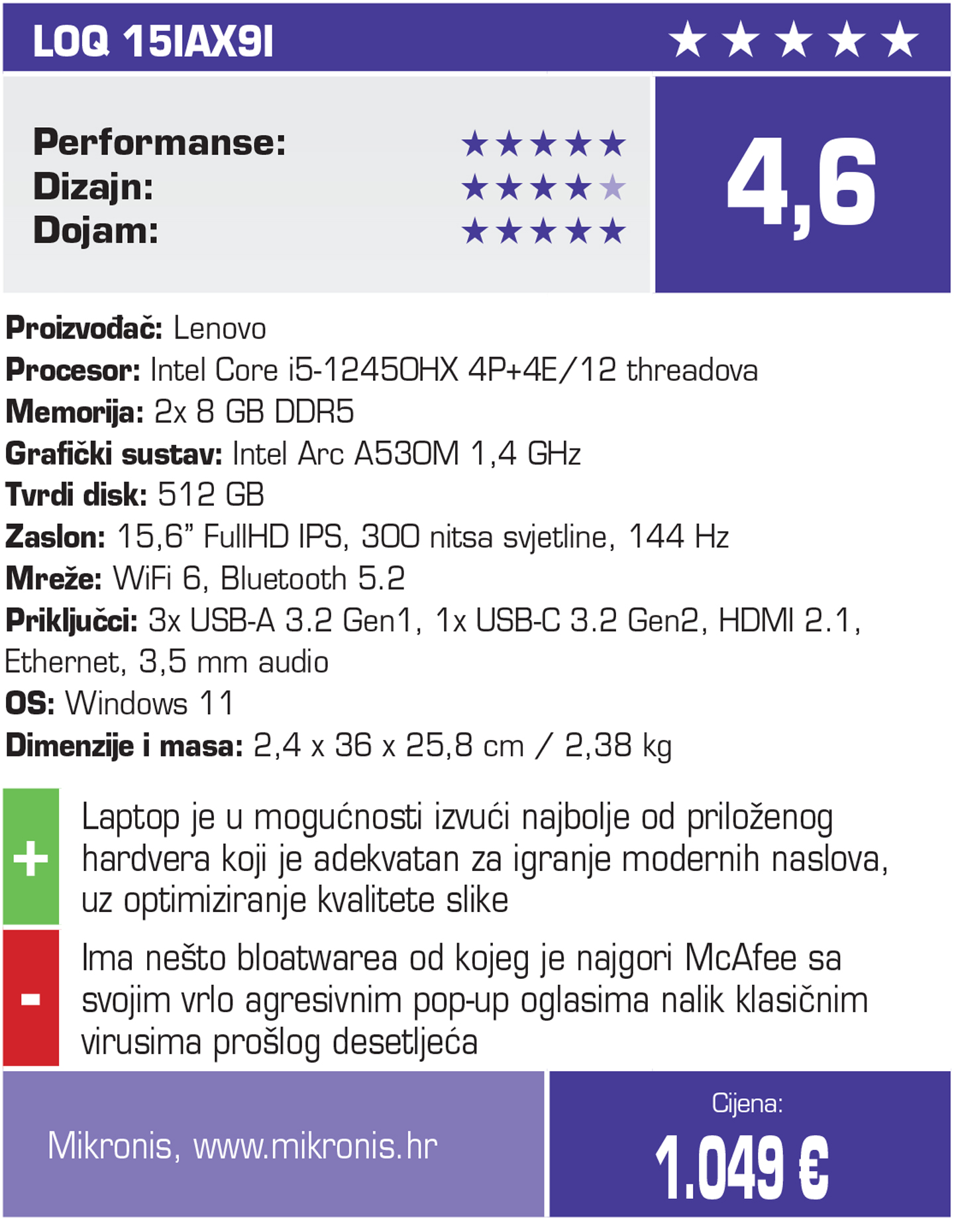 Pogledajmo sada najbitnije komponente. Već smo spomenuli da laptop ima 2x 8 GB zamjenjivog DDR5 RAM-a, kao i 512 GB pohrane koja dolazi u M.2 2242 izdanju. No procesor koji sve pokreće je Intelov Core i5-12450HX sa ukupno osam jezgri od kojih su četiri Performance jezgre i četiri Efficiency jezgre koje pomažu u pozadinskim zadacima. Četiri glavne jezgre imaju aktivan Hyperthreading tako da ukupno dobivate 12 radnih threadova istovremeno. Ovaj model procesora nudi odlične specifikacije, a specifično je dizajniran za sustave sa dobrim hlađenjem da iz njega izvuku maksimum. Nudi turbo boost do 4,4 GHz, te će biti adekvatan za gaming dulji niz godina. Integrirana grafika također može poslužiti za gaming na bateriji, ako se radi o jednostavnijim naslovima i ako im ograničite frame rate. Za gaming na punjaču, tu je dedicirana Intel Arc A530M grafička kartica s 12 Xe jezgri i 4 GB dedicirane GDDR6 memorije koja omogućuje igranje većine modernih igara na solidnoj (srednjoj) kvaliteti u FullHD rezoluciji. Ako se primite multiplayer igara s optimiziranim grafičkim postavkama, bez problema možete igrati i iznad 60 fps-a, a sve ovisi o vašim grafičkim postavkama. Kod modernih naslova moguće je aktivirati i Intelov AI Upscaling XeSS, no morate pronaći listu podržanih igara (koja se sve više širi). Novije igre će mahom podržavati ovakve tehnologije, tako da ste osigurani i za gaming u narednim godinama. Ono što mi savjetujemo je da sustav hlađenja održavate čistim kako bi se postizao maksimum iz ovog laptopa.