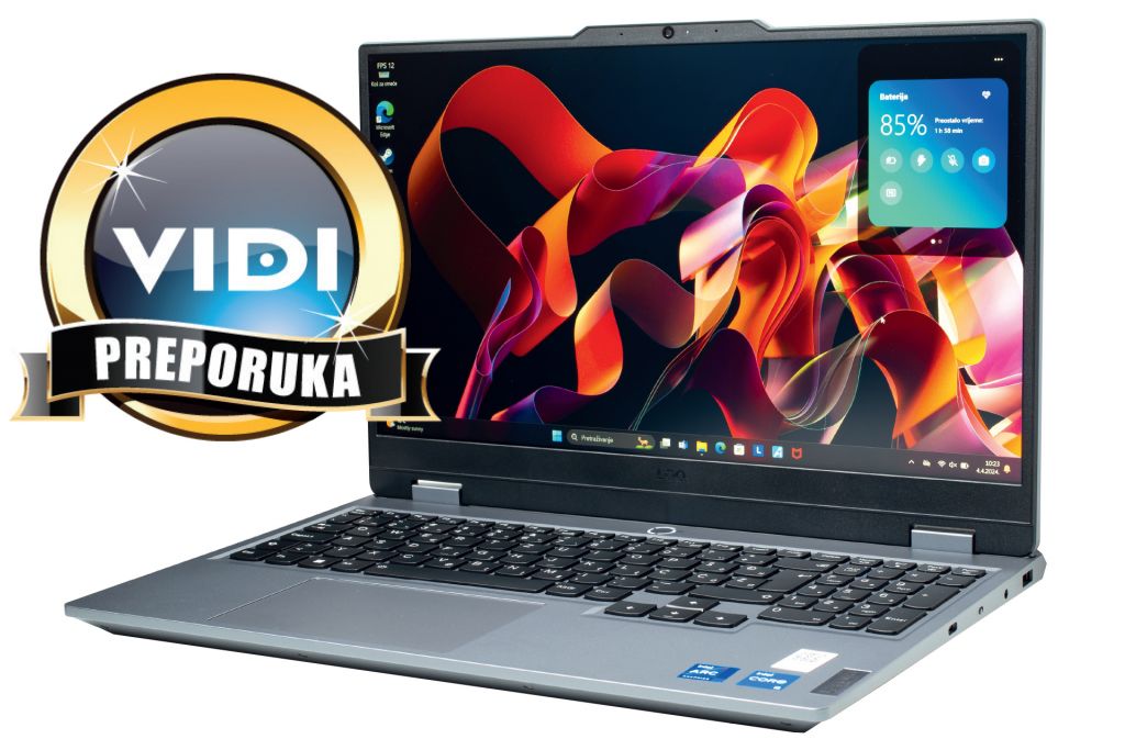 Model koji testiramo je Lenovo LOQ 15IAX9I koji dolazi s punim Intel sustavom. Točnije, ima Intelov procesor, kao i dediciranu grafičku karticu za gaming jednom kada ste prikopčani na napajanje. I dalje govorimo o gaming laptopu od 1.000 eura, no to je neizbježan detalj gaminga danas. Laptop dolazi u matiranoj sivoj boji bez dodatnih osvjetljenja kućišta, te je dizajn dovoljno suptilan da prođe kao ozbiljniji model za studentske ili uredske potrebe, a jedino ga odaje dizajn s pojačanim hladnjakom iza zaslona, kao i veliki LOQ brending na stražnjem rubu zaslona.