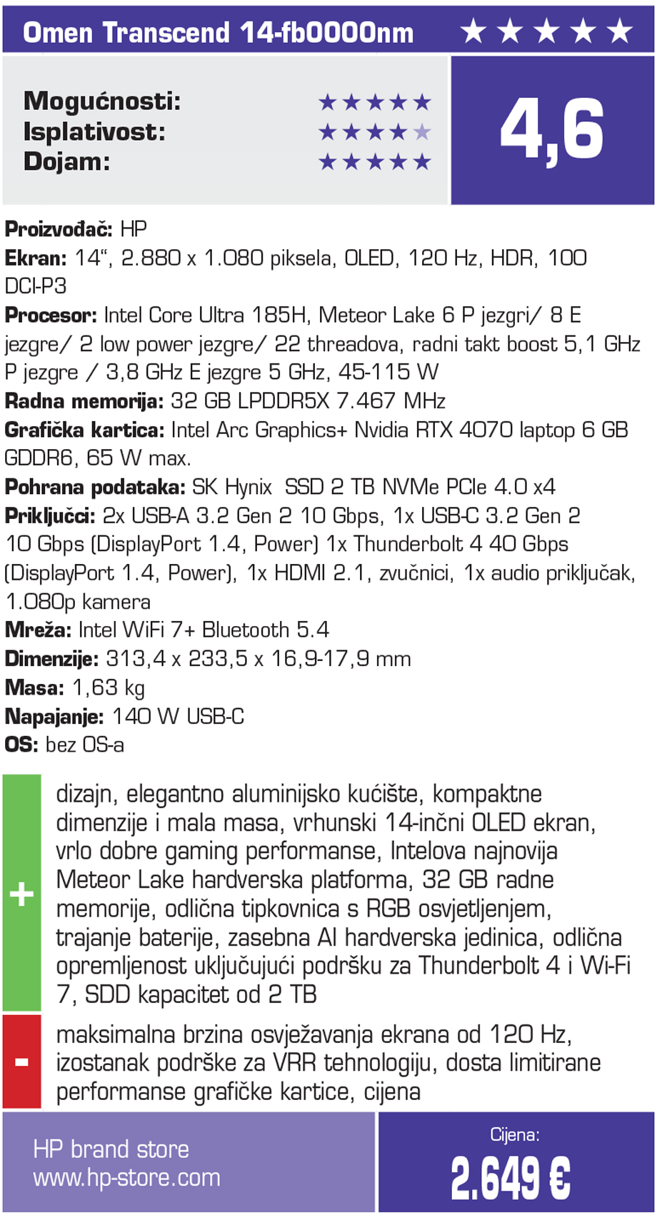 Na kraju, važno je naglasiti kako ugrađeno hlađenje odlično obavlja svoj posao, tako da su temperature na površini uređaja vrlo prihvatljive, a buka u razumnim granicama. Nema nikakve sumnje kako je 14-inčni HP-ov Omen Transcend osebujan high end gaming laptop super dojmljivog dizajna.