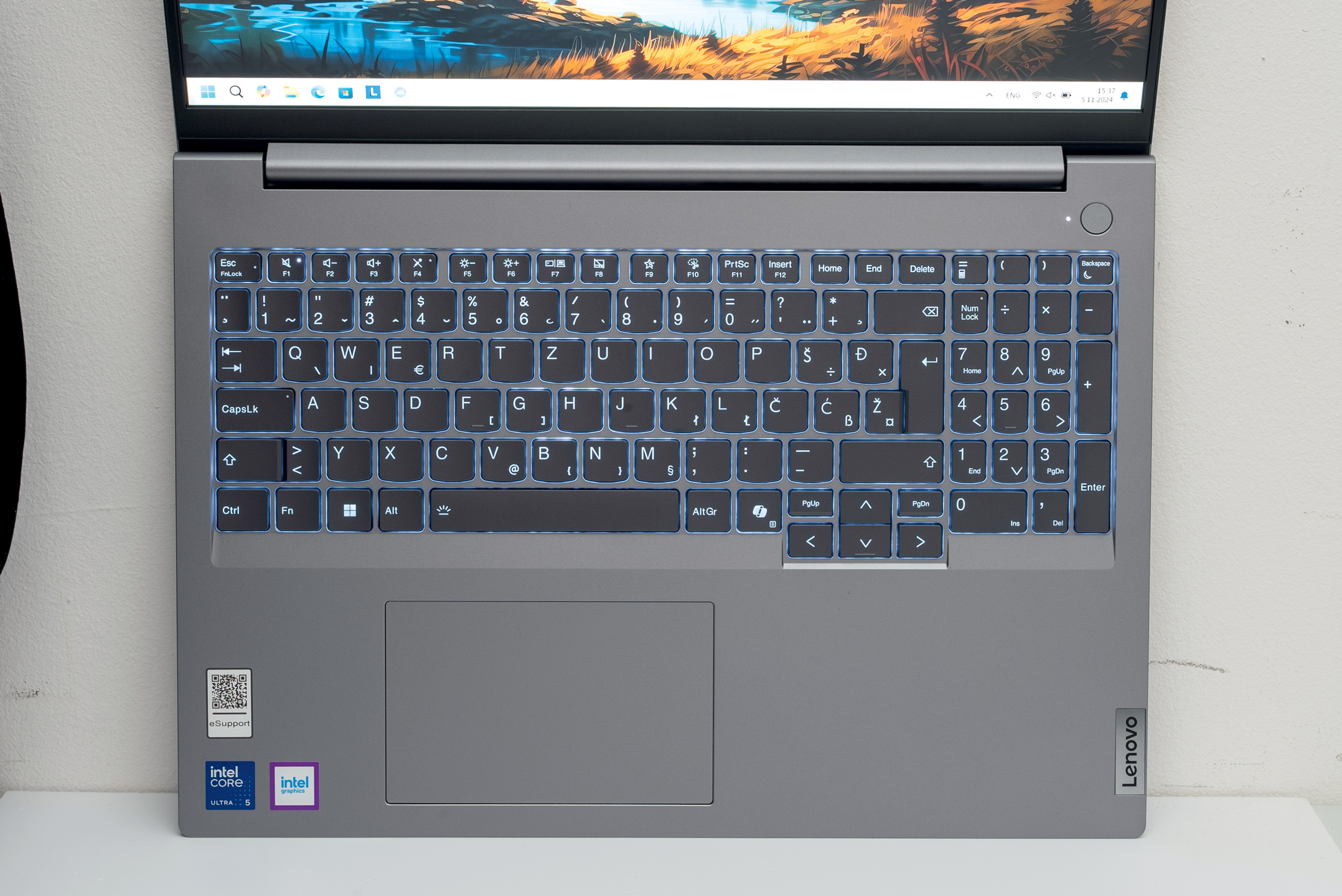 Svakako jedna od prednosti ovako većeg laptopa je i vrlo prostrana tipkovnica s velikim tipkama i numeričkim dijelom. Pritom ovdje kao kod većine modernih laptopa nalazimo posebnu Copilot tipku. Tipkovnica također posjeduje pozadinsko osvjetljenje s bijelim LED-icama. Osjećaj prilikom tipkanja je prilično dobar. Tipke su mekane i vrlo tihe, iako im možda nedostaje malo „hoda“, odnosno povratne reakcije prilikom pritiska.Ugrađeni touchpad je dovoljno velik, podržava sve uobičajene napredne geste i relativno je precizan. Vjerujemo ipak kako će većina korisnika, posebno prilikom rada u uredu, s ovim laptopom koristiti bežični miš.