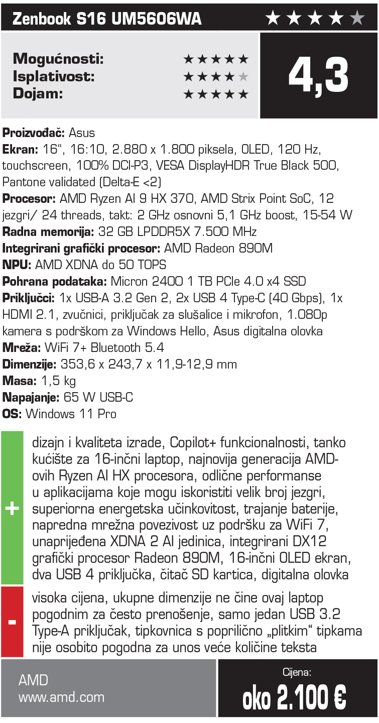 Novi Zenbook S16 je odlična demonstracija mogućnosti nove generacije AMD-ovih Ryzen AI procesora. Posebno ako tražite tanak i lagan laptop s velikim 16-inčnim ekranom. Kombinacija izvrsnih performansi, impresivnog OLED ekrana, moderne opremljenosti, iznimne energetske učinkovitosti i dugog trajanja baterije svakako je gotovo idealna u svijetu ultraprijenosnika. Nažalost, ovaj je model Zenbooka S16 trenutno poprilično nedostupan (modele s Rzyen AI 365 procesorom je lakše pronaći), a i cijena mu je zaista dosta visoka.