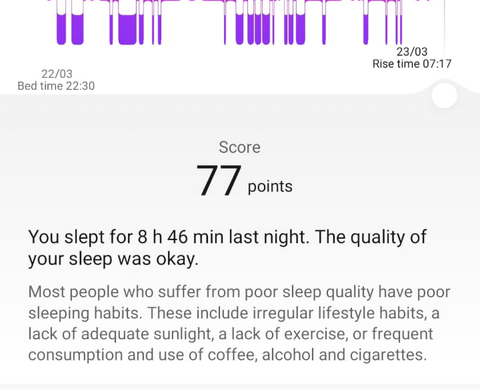 Smatramo da iskustvo na ovom satu uistinu upotpunjuje njegova aplikacija “Zdravlje”. Preglednog je dizajna te će vam pokazati sve detalje trenutnog dana, od prijeđenog puta, rekreacije i otkucaja srca, do toga da prati vaš stres te vam, ako ga nosite noću, daje i informacije o kvaliteti sna. Iako prikaz na aplikaciji nije detaljan kao kod više sportski orijentirane konkurencije, prosječan korisnik dobit će sve zanimljive podatke, iako bismo voljeli bolji pregled statistika kroz dulji vremenski period.