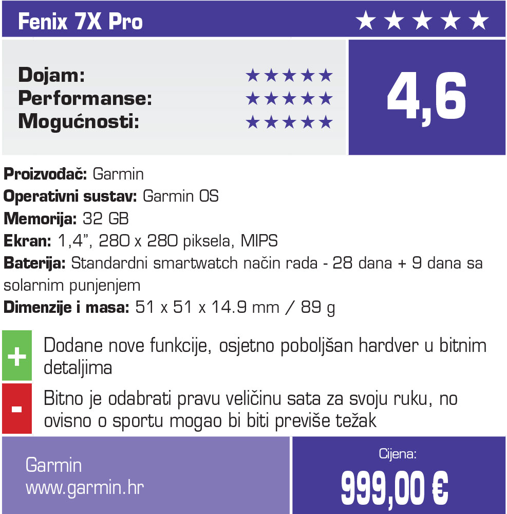 Fenix serija pokazala se omiljenom kod sportaša koji preferiraju rekreaciju na otvorenom, a novi Fenix 7X Pro najbolja je moguća verzija njihovog sustava. Bitno je naglasiti da iako na testu imamo najveći od tri sata, sva tri modela dolaze s jednakim funkcijama, a jedina razlika je (osim veličine) u kapacitetu baterije.