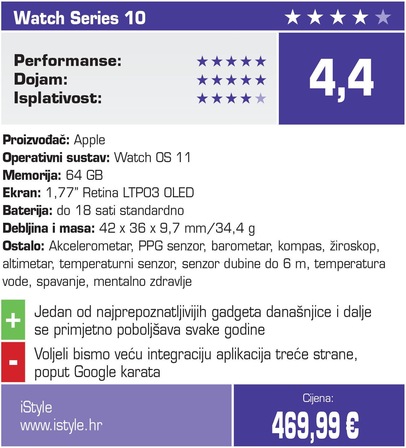 Dolazi i novi čipset, S10 koji koristi dvije jezgre kao i dosadašnji S9, no zauzima manje prostora u samom satu. Tu su još natiskani brojni senzori, pa osim otkucaja srca, mjerite i zasićenost krvi kisikom, EKG, detekciju nepravilnog rada srca, praćenje cardio fitnessa, praćenje kvalitete sna, disanje, temperaturu tijela, detekciju pada i pozivanje SOS-a, mjerenje dubine vode do 6 metara, a tu su i kompas, barometar, akcelerometar, žiroskop i brojni drugi detalji.