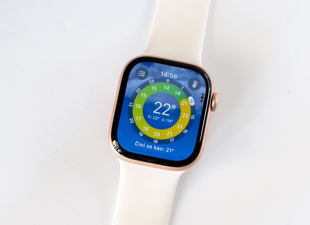 Kako smo spomenuli, manji sat sada ima dijagonalu od 42 mm, pa je zaslon malo veći, no zato mu je debljina smanjena na 9,7 mm što je svakako dobrodošla promjena s estetske strane, kao i ugodnijeg nošenja. Ekran ima rezoluciju 374 x 446 piksela, a klasično je pravokutnog dizajna, sa zakrivljenim kutovima što mu daje optimalnu površinu za prikaz velikog broja podataka. Ekran doseže do 2.000 nitsa na danjem svjetlu, a kako smo spomenuli, OLED tehnologija ovdje ima i širi kut gledanja bez pada kvalitete prikaza sadržaja.