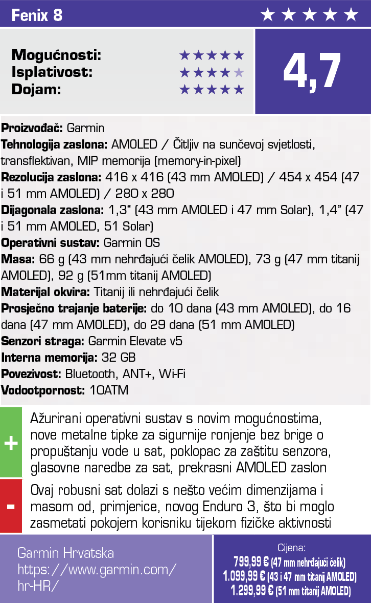Fenix 8 dolazi u nekoliko kombinacija veličina, korištenih materijala i tehnologija zaslona. S veličinama od 43, 47 i 51 mm, svaki korisnik pronaći će veličinu koja mu odgovara. Nama se osobno najviše svidio 47 mm Fenix, ali tu se radi isključivo o osobnim preferencijama kakve satove volite nositi. Tu bismo samo napomenuli da će veći modeli imati duže trajanje baterije, ali i nešto veću masu. Upravo zato nam se srednji odabir čini kao zlatna sredina. No krenimo dalje.