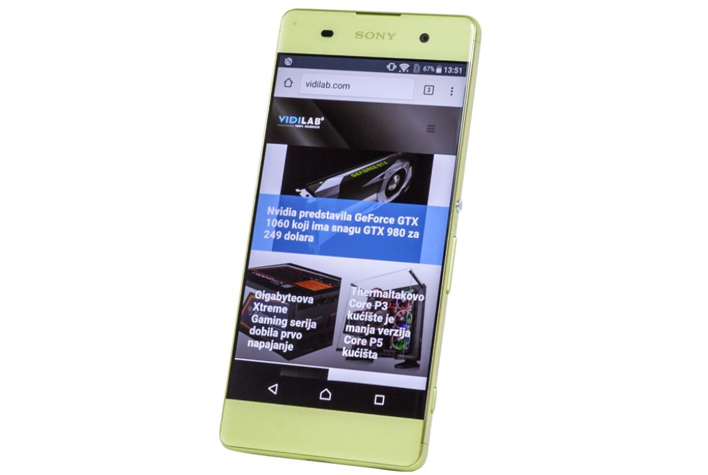 Ekran je, kao i kod svih dodirnih mobitela, u fokusu svega. U slučaju s XA ekran je i u fokusu u dizajnerskom smislu. Ekran je u 2.5D obliku, što označava lagano zaobljene i rubove, no niti približno onima na Samsungovim Edge modelima. Više se radi o zaobljenju kako bi se stekao dojam tankoće kućišta. I zaista, kućište djeluje mnogo tanje nego što bi njegovih 7,9 mm dalo naslutiti. Bočni obrub jedva je deblji od 3,5 mm audio utora na vrhu. Ekran pak djeluje kao da se radi o svetom gralu mobilnih ekrana, edge-to-edgeu. Međutim, ipak se ne radi o ekranu koji se proteže od lijevog do desnog ruba već se radi o dizajnerskom triku budući da se uz sam panel nalazi crni obrub od oko pola milimetra, koji nije vidljiv kada je ekran isključen. Xperiji XA to nećemo uzeti za zlo budući da mobitel s isključenim ekranom izgleda odlično, pomalo neobično i atraktivno.