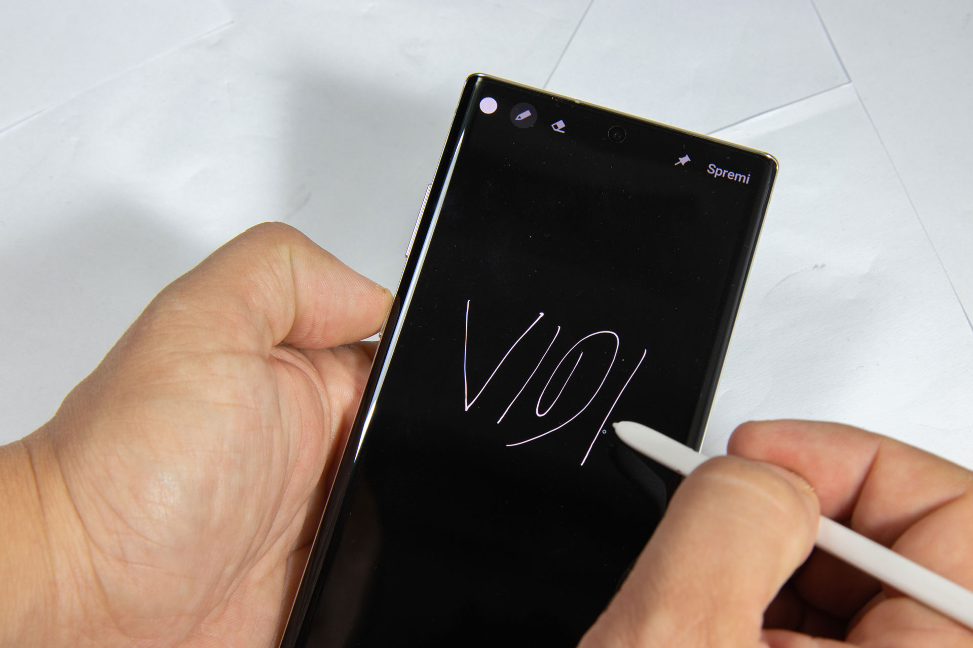 Samsungov stylus, iliti S-Pen olovka, mogućnost je koja izdvaja Note 10+ od konkurentnih mobitela. Među novitetima su geste koje se nadovezuju na priču o kameri, pa tako kružnom gestom možete zoomirati sliku, pritiskom na tipku na S-Penu snimate fotku, a dvostrukim pritiskom mijenjate kamere. Pokretom prema naprijed ili nazad također se mijenja kamera snimanja, dok su geste ulijevo i udesno zadužene za promjenu načina snimanja.