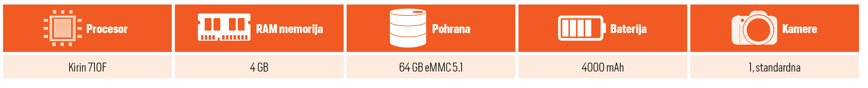 Hardverski, dobivate solidan mid-range procesor od Huaweija, Kirin 710F. Ima četiri jače Cortex A73 jezgre za brzo obavljanje zadataka i četiri slabije Cortex A53 jezgre za pozadinske aplikacije. Sigurno će raditi još godinama bez previše trzanja. Jedini minus kod procesora je slabija grafička komponenta koja neće sve gaming naslove moći vrtjeti punom brzinom. Dobivate i 4 GB RAM-a te 64 GB pohrane sa sporijom eMMC 5.1 tehnologijom.