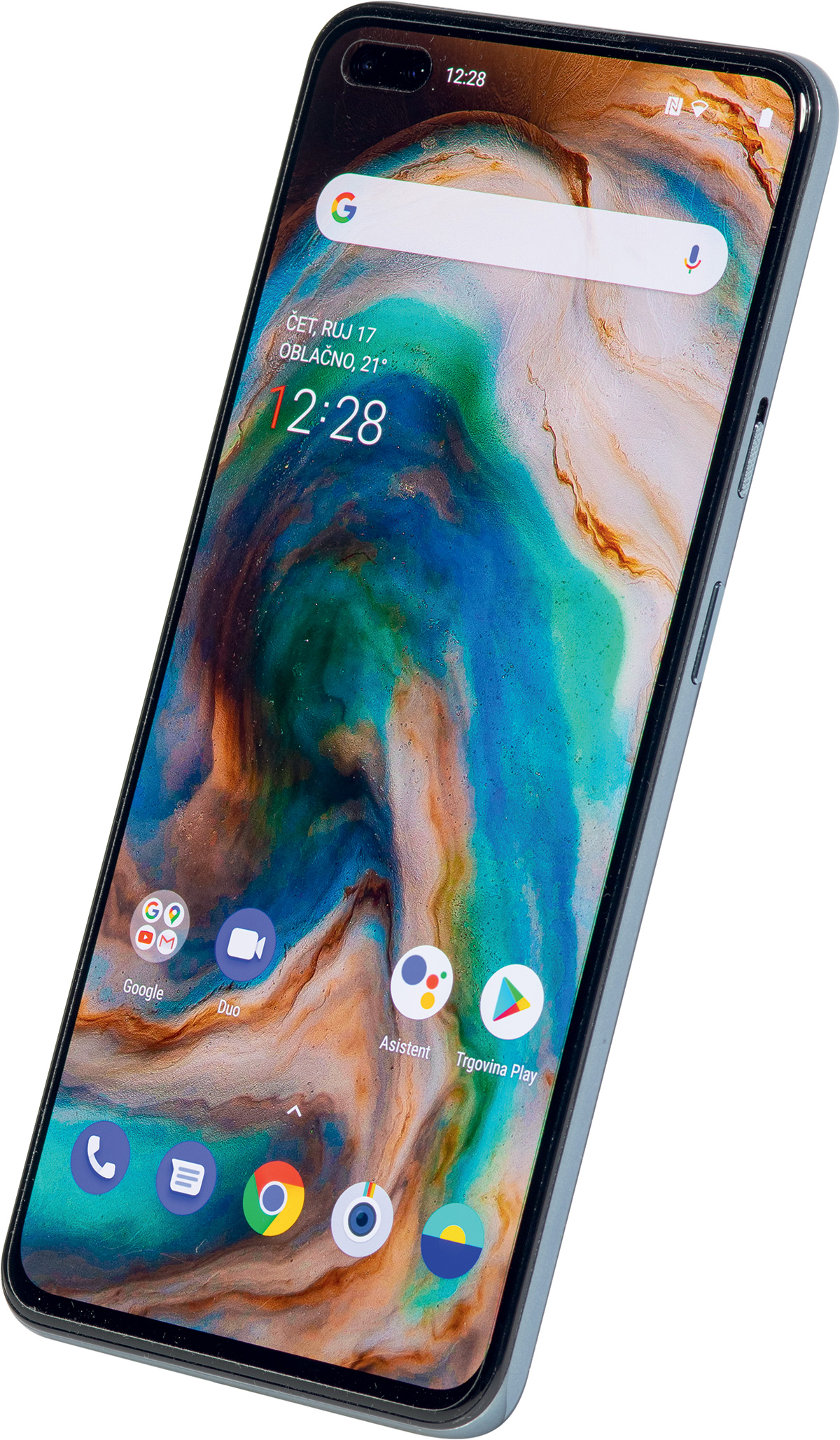 OnePlus Nord sprijeda je nešto manji s dijagonalom od 6,44 inča, što ga ukupno čini jednostavnijim za rukovanje dijelu korisnika. Zaslon mobitela potpuno je ravan, dok mu na rubovima zakrivljenost daje tanka sjajna crna plastika koja odvaja zaslon od obruba kućišta. Pod prstom je osjećaj gotovo jednak kao i kod zakrivljenog zaslona.