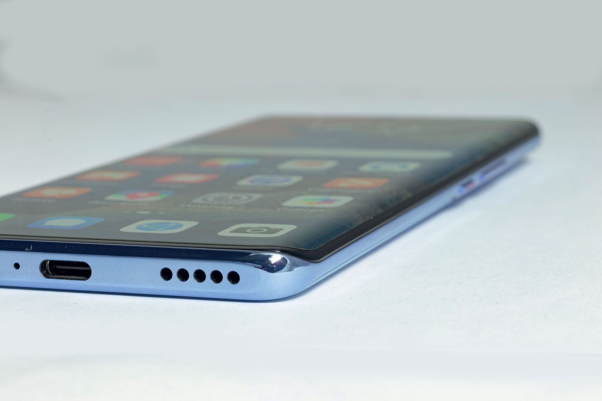 Prednja strana mobitela daje mu uistinu premium izgled jer se radi o velikom zaslonu s tankim rubovima i zakrivljenim dizajnom. Zakrivljeni rubovi daju mu dodatan dojam tankog dizajna te vrlo čvrsto stoji u ruci i bez maske. Vrh zaslona ima malu rupicu za selfie kameru, a zvučnik za pozive nalazi se na samom gornjem rubu zaslona. Sam zaslon koristi OLED tehnologiju što nudi vrlo žarki i precizan prikaz sadržaja bez blijedog efekta na visokoj svjetlini kao kod IPS zaslona, a nema niti sjena oko rubova kakve se ponovno mogu naći kod IPS zaslona. OLED ima 10-bitni prikaz boja što mu nudi prikaz oko milijarde boja te podržava HDR standarde za atraktivan prikaz kompatibilnog sadržaja. Također podržava 120 Hz brzinu osvježavanja te možete birati želite li forsirati 120 ili 60 Hz ili prepustiti odluku softveru, a sve naravno utječe na trajanje baterije. Mobitel također može spustiti rezoluciju s FullHD na HD radi uštede energije na isti način kao i brzinu osvježavanja. Tu je i precizno namještanje boja koje se prilagođavaju prikazu, od točnih sRGB do umjetno zasićenih, a možete i precizno birati toplinu prikaza.