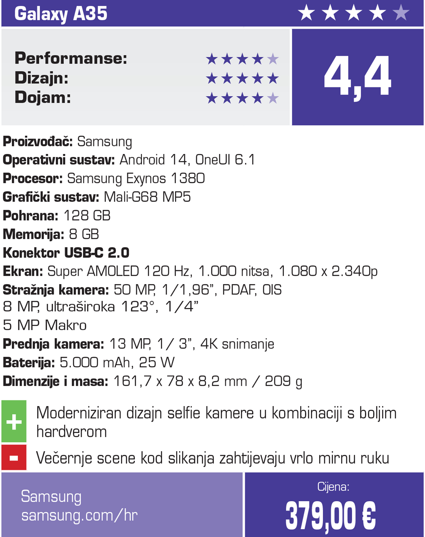 Nakon brojnih Samsungovih flagship modela koje smo testirali, imamo priliku vidjeti što nude i za nas ostale u svojoj ponudi. Serija A predstavlja odličan omjer uloženog i dobivenog, a novi A35 dobio je nadogradnje ove godine na, po nama, ključnim mjestima te je lako zamijenio prošlogodišnju verziju.