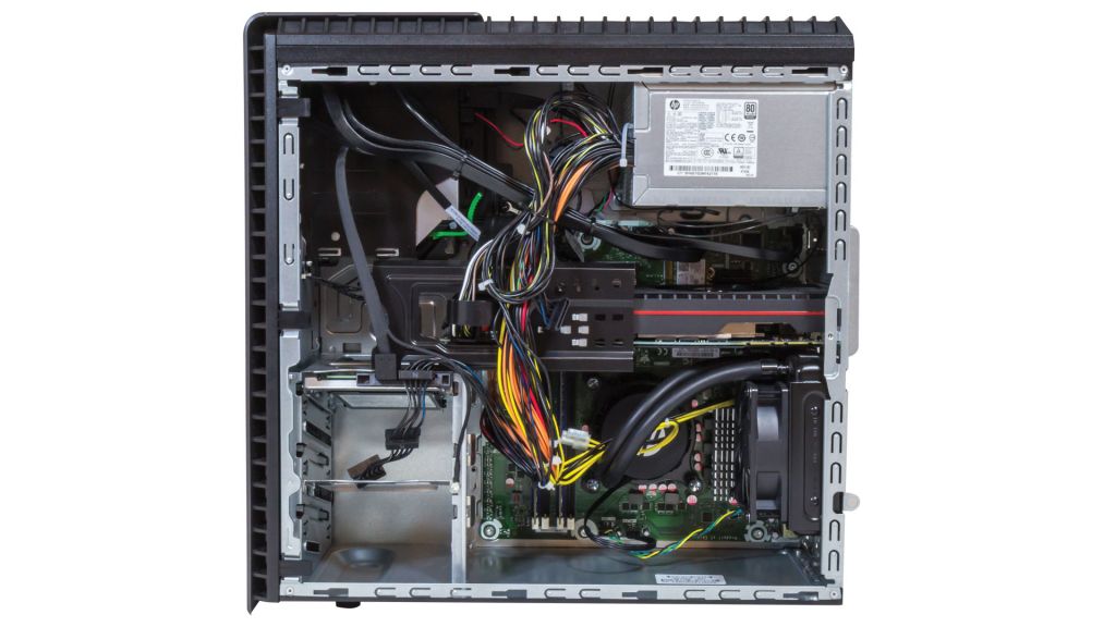 No, prema daljnjim specifikacijama, sličnosti s business svijetom od sada prestaju. Omen je konfiguriran s maksimalno podržanim procesorom za ploču, Intelovim 6700K procesorom s 8 logičkih dretvi, s radnim taktom od 4,0 GHz. Po pitanju hlađenja procesora smo ostali pomalo zapanjeni. Prvotno, dok smo testirali računalo bili smo oduševljeni njegovom tišinom obzirom na veličinu, a pravi razlog tome je postao jasan tek kada smo otvorili računalo. Za hlađenje procesora je zadužen AiO vodeni hladnjak koji nosi HP branding, vjerojatno plod suradnje HP-a i jednog od eminentnijih proizvođača AiO hladnjaka. Dojma smo da se pod bilo kojim opterećenjem ventilator uvijek vrti oko nižeg broja okretaja, budući da je veoma efikasan pri hlađenju. To pak znači da se i pri niskom opterećenju proizvode zvukovi, dijelom iz vodene pumpe, dijelom iz ventilatora. Uzmemo li u obzir da računalo ima samo jedan bočni usis, vodeni hladnjak svoj posao radi odlično.