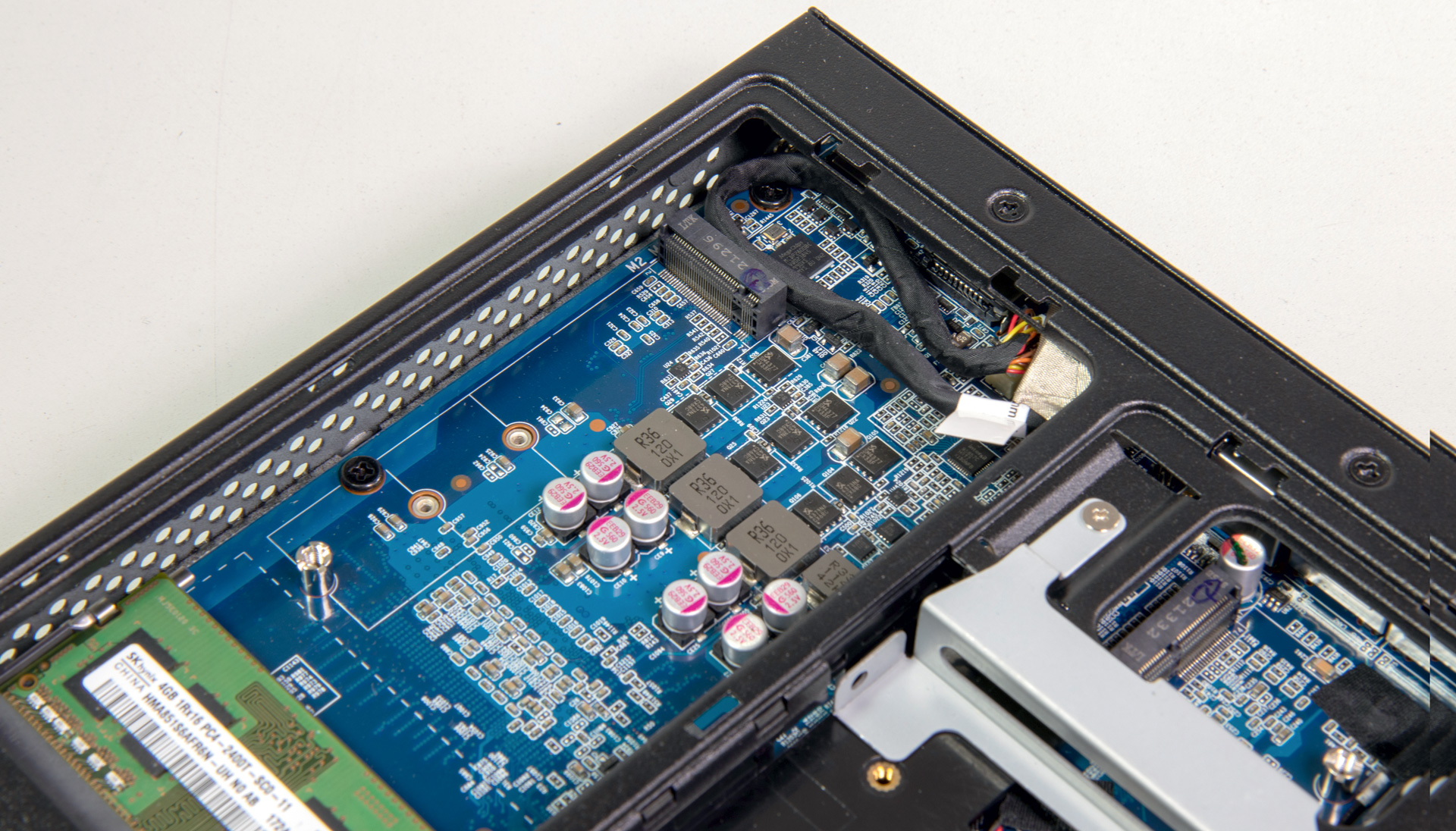 Instalacija radne memorije i diska je vrlo jednostavna. Svaka od ovih komponenti nalazi se skrivena iza zasebnih „vrata“ (poklopca) kojima pristupamo vrlo lako jer je potrebno odvrnuti samo jedna vijak. DS20U podržava dva SO-DIMM utora i omogućuje ugradnju do 64 GB radne memorije brzine do 2666 MHz. Što se tiče pohrane podataka, na raspolaganju su vam M.2 PCI2.0 x4 utor i 2,5“ SATA utor.