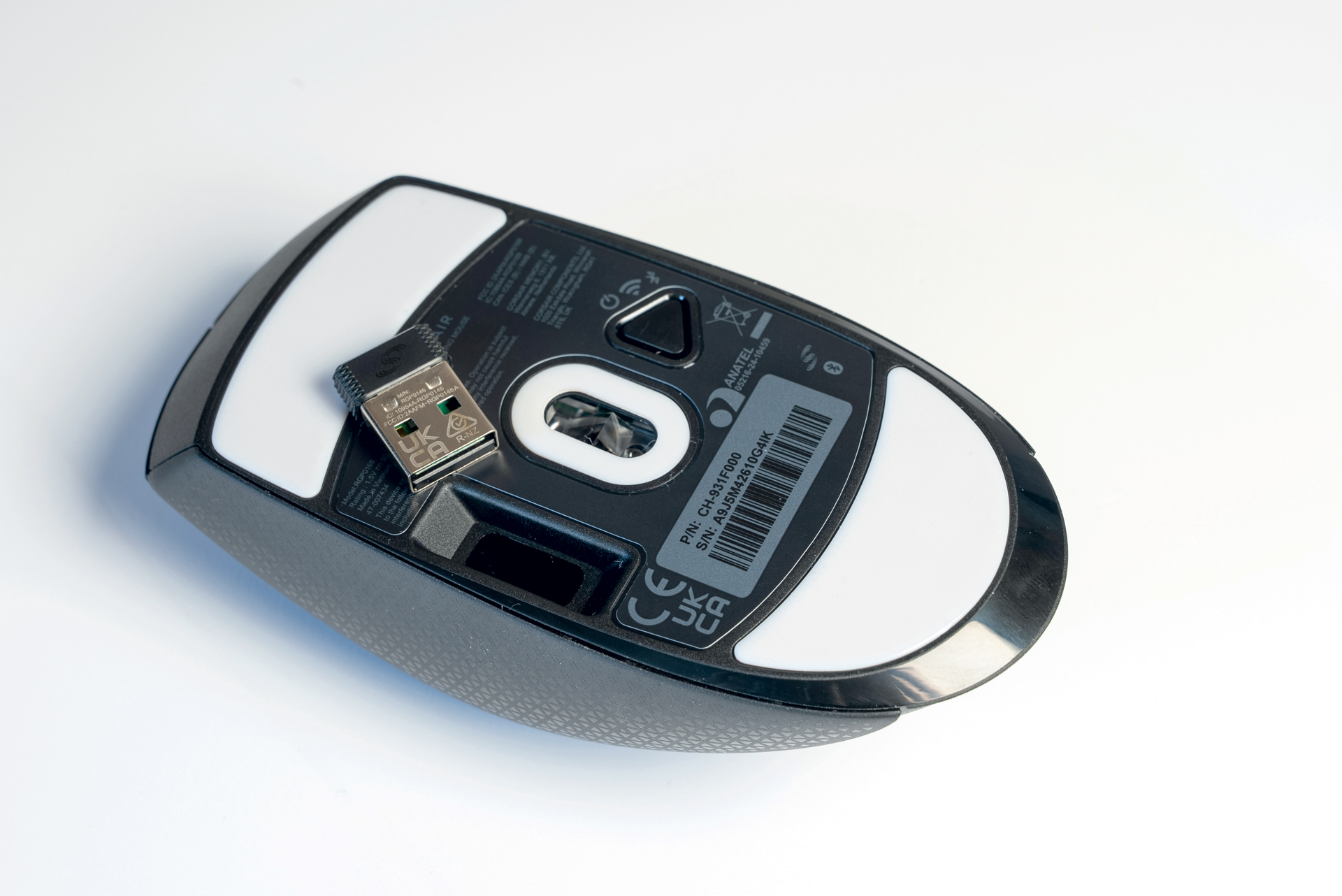 Odmah naglasimo da je M55 Wireless moguće koristiti isključivo bežično. Dakle, nemate mogućnost žičnog korištenja. Kako bi cijena bila što povoljnija, Corsair koristi - nekada sasvim uobičajen - klasičan način napajanja bežičnog miša u obliku jedne AA baterije. Ovo ima neke svoje prednosti, te ćete bateriju jednostavno zamijeniti po potrebi, ali i nedostatke. Naime, ukupna masa miša se povećava korištenjem baterije. M55 Wireless bez baterije teži oko 60 g što je relativno lagano. S baterijom je osjetno teži, ali i dalje je riječ o prilično laganom gaming mišu.